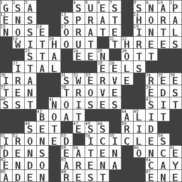 ACROSS 1. Girls' org. (abbr.) 4. Institutes legal proceedings 8. Fastener 12. Followers of ems 13. Small fatty European fish 14. Israeli folk dance 15. Sense of smell 17. Speak pompously 18. International (abbr.) 19. Sans 21. Threesomes 23. R.R. building 24. Car or cant ending 26. Baseball player Mel 27. Slanted text style (abbr.) 28. Snakelike fish 30. Retirement account (abbr.) 31. Turn aside suddenly 34. Portuguese money of account (variant) 37. Nine, plus one 38. Collection of objects 39. Begley and Asner 40. Fast jet (abbr.) 41. Annoying sounds 42. Be seated 43. Water vessel 44. Came down and settled, as after flight 46. Arrange properly for use 47. Double-curved letter 50. To free from 51. Pressed 54. Winter's stalactites 57. Habitations of wild animals 58. Consumed 60. At one time in the past 62. Inside; within (prefix) 63. Sports stadium 64. Island 65. Arabian gulf 66. Respite 67. Compass dir. DOWN 1. Commissioned mil. rank 2. Frozen precipitation 3. Helper 4. Upset 5. A salt of uric acid 6. Ingest 7. Proofreading order 8. Upper-body garments 9. Music written for nine 10. Johnson of "Laugh-In" 11. Friends 13. "Barney Miller" actor Jack 16. Singer James 20. Actor Linden 22. Opening into or through something 25. Impudent aggressiveness 27. Angers 29. Nights before holidays 30. It is 31. Portico 32. Compose 33. Greek goddess of the dawn 34. Home 35. Prepare for publication 36. Eastern Standard Time (abbr.) 41. Observe 43. Gillaume's butler role 44. Curve 45. _ and Stitch 46. Something which is sent 48. Locates 49. Odor 51. It may be bright or harebrained 52. Tear apart 53. Letter starter 55. _ tizzy (2 wds.) 56. Examine hastily 59. "We ___ not amused" (Victoria) 61. Sight organ