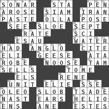 ACROSS 1. Echolocation 6. R.R. building 9. Animal enclosure 12. Came up 13. Thailand, formerly 14. SW Asia republic 15. Thick mixture 16. Rounded earthenware pot or jar 17. Airs 18. Perceive with the eye 19. A type of plum 20. Back-to-school mo. 21. Pace 23. _-fi 24. He sold his birthright 25. Wetness 28. Possessed 30. White American of non-Hispanic descent 34. Quote 35. Biblical high priest 36. Honkers 38. _ moment's notice (2 wds.) 39. Loose flowing garment 41. Trap for birds or small mammals 43. Scottish cap 44. Exchanges for money 46. Heavy book 48. Raised railways 49. French philosopher Descartes 50. A single undivided whole 51. Writer Wiesel 53. Compass dir. 56. Butter sub 57. Oscar Madison type 58. Sadhe (variant) 60. Political cartoonist Thomas 61. Hearing organs 62. Sun: prefix 63. Followers of ems 64. One (Scot) 65. _____ Park, CO DOWN 1. Plant excrement 2. Mouths or openings 3. Characteristic smell of wine 4. Michaelmas daisies 5. To riddle 6. Grain storage tower 7. Story 8. Housemaid (var.) 9. Appease 10. Compass direction 11. Compass dir. 13. Not divided or shared with others 14. Medicinal drug used to evoke vomiting 19. Feeling sharp psychological pain 20. Compass dir. 22. American Automobile Association (abbr.) 24. The property of being fit to eat 26. Singer James 27. 480, 500 or 516 sheets of paper 28. Possessive pronoun 29. Medicinal plant 31. Commissioned mil. rank 32. Lion 33. Bear (Spanish) 37. First name in cosmetics 40. American author Paul (1891-1958) 42. A really long time 45. Fast jet (abbr.) 47. Makes clutter 49. Chest bones 50. ____ Bator 51. Enthusiasm 52. Old wives' tales, e.g. 54. Table seasoning 55. Singer Brickell 56. Single 57. Ocean 58. Definite Article 59. Greek goddess of the dawn