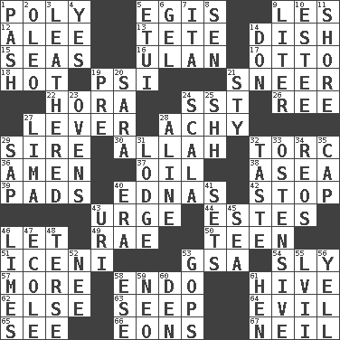 ACROSS 1. Much (prefix) 5. The front part of a cuirass 9. French article 12. Toward shelter 13. Wig 14. Food container 15. Oceans 16. ____ Bator 17. "Beetle Bailey" pooch 18. Being at a high temperature 19. 23rd letter of the Greek alphabet 21. Scornful expression 22. Israeli folk dance 24. Fast jet (abbr.) 26. To sift 27. Prying instrument 28. Painful 29. Male parent of an animal 30. Assad's deity 32. Torque (variant) 36. So be it 37. Lubricate 38. Toward the sea 39. Writing tablets 40. Ferber et al. 42. Close up, plug up 43. Goad 44. _____ Park, CO 46. Allow 49. Actress Charlotte 50. Adolescent 51. Ancient Celtic tribe of eastern Britain 53. Girls' org. (abbr.) 54. Secret 57. Greater amount 58. Inside; within (prefix) 61. Hub of activity 62. Otherwise 63. Ooze 64. Tending to cause great harm 65. Observe 66. Immeasurably long periods of time 67. Famous astronaut Armstrong DOWN 1. Romantic infatuation 2. Margarine 3. Resembling or made to resemble leather 4. Consenting reply 5. Needle holder 6. Set 7. Call ___ day 8. Elected rep. 9. 61 cubic inches 10. First name in cosmetics 11. Dinah or Pauly 14. Spanish title 19. Before (prefix) 20. "Two Mules for Sister ____" 21. Filthy place 23. Baking chambers 24. Any of the three canals of the cochlea 25. Quiet! 27. Pale green bean 28. Place in a line 29. Plant excrement 31. Cabin 32. Clothes sense 33. Clearly or manifestly demonstrative 34. Vintage cars 35. Head covering 40. Period 41. Arranges properly for use 43. RI univ. 45. Ocean 46. Citrus fruits 47. Learning spot: Fr. 48. Laconic 52. Born 53. Republicans 55. 57 in ancient Rome 56. Shout 58. Compass dir. 59. Modern: prefix 60. Lair 61. Layer