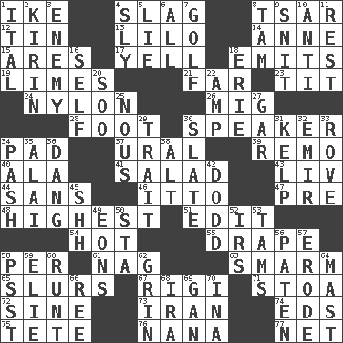 ACROSS 1. D.D.E's nickname 4. Volcanic refuse 8. Russian ruler of old 12. Metal container 13. _ and Stitch 14. Queen of England 1702-14 15. Ancient Greek god of war 17. Shout 18. Gives off 19. Citrus fruits 21. Distant 23. Teat (slang) 24. Thermoplastic polyamide 26. Russian fighter aircraft 28. Pick up the tab 30. Orator 34. Groovy apt. 37. Mountain range 39. San ____ (Riviera town) 40. Insect wing 41. First course 43. 54 in ancient Rome 44. Without 46. "Tell ____ the Marines!" 47. Before (prefix) 48. Having the greatest elevation 51. Prepare for publication 54. Being at a high temperature 55. Window treatment 58. For each 61. Tired old horse 63. Excessive but superficial compliments 65. Disparaging remarks 67. Swiss mountan, "Queen of the Mountains" 71. Portico 72. Trig term 73. SW Asia republic 74. Begley and Asner 75. False hair 76. Grandmother 77. Fish or hair follower DOWN 1. Slanted text style (abbr.) 2. Japanese brewing company 3. Foe 4. Playfully artful 5. Whopper 6. 100% 7. _ course 8. Scottish cap 9. In a ____ (agitated or irritated) 10. Opposed to 11. Relief 16. Itself 18. 4th largest of the Great Lakes 20. "Barney Miller" actor Jack 22. Electrical Unit 25. Good sense 27. Slender fish 29. Distinguishing feature 30. Chalkboard 31. Seaweed 32. Arab leader 33. Be footloose 34. Romantic infatuation 35. Mountain range southwest of Kyrgyzstan 36. Mild oath, euphamism for damn 38. Keyboard modifier key 42. Texas town _ City 45. Quiet! 49. Immeasurably long periods of time 50. R.R. building 52. Big collection agency 53. Scottish caps 56. Eucharist need 57. Eat (away) 58. Inconspicuous attention getter 59. Writer Wiesel 60. The smallest animal of a litter 62. Broad smile 64. Vertical spar for supporting sails 66. To sift 68. Retirement account (abbr.) 69. Separate the seeds from cotton 70. _ tizzy (2 wds.)