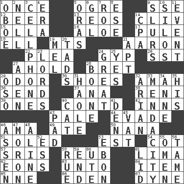 ACROSS 1. At one time in the past 5. Legendary monster 9. Compass dir. 12. Fermented drink made from hops 13. Vintage cars 14. 154 in Roman numerals 15. Spanish pot 16. Medicinal plant 17. Whine 18. Pipe bend 19. Mountains (abbr.) 21. Composer Copland 22. Entreaty 24. Con 26. Fast jet (abbr.) 27. Hold, grip (Informal) 28. Cy Young winner Saberhagen 29. Aroma 30. Imelda's hoard 32. Housemaid 36. Post 37. Santa ___, CA 38. Painter Guido (1575-1642) 39. Washington bills 40. Continued (abbr.) 42. Restaurants 43. Light colored 44. Dodge 46. Housemaid (var.) 49. Had dinner 50. Nanny 51. Having a sole or soles 53. Eastern Standard Time (abbr.) 54. Small bed 57. Indian titles of respect 58. Reuben's nickname 61. Pale green bean 62. Immeasurably long periods of time 63. To (old English) 64. Detail 65. Compass dir. 66. Paradise 67. Centimeter-gram-second unit of force DOWN 1. Mitch Miller's instrument 2. 1994 drama film starring Jodie Foster 3. Portable communications device 4. Period 5. Mouths or openings 6. Set 7. Friend of Pooh 8. Compass dir. 9. Runs notes together 10. Grain storage towers 11. Happening 14. Tax preparer (abbr.) 19. Cartoonist voice _ Blanc 20. Small boys 21. Fitting 23. Titled peers of a realm 24. Relatively large 25. It is so 27. An important port of Yemen 28. Child's nurse 29. Bear (Spanish) 31. White Person, in Hawaii 32. Believer in; advocate of (suffix) 33. Ananias' fault 34. Queen of England 1702-14 35. Part of HMS, perhaps 40. Feline 41. Lairs 43. Groovy apt. 45. Large container 46. NE Netherlands city 47. Person of subnormal intelligence 48. Place in a line 52. Double-curved letter 53. Inky black, to poets 55. Sign of things to come 56. Docile 58. Regret 59. Conclusion 60. Shoshoni 61. Flaplike covering