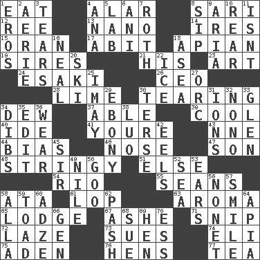 ACROSS 1. Consume 4. Having or resembling wings 8. Indian skirt 12. To sift 13. Billionth: prefix 14. Angers 15. Northwest Algerian city 17. "This won't hurt ____!" 18. Bee-related 19. Fathers 21. Part of HMS, perhaps 23. Nonscientific branch of learning 24. 1973 Nobel Price Winner (Physics) Leo 26. Corporate head (abbr.) 28. Citrus frut 30. Rending 34. Morning condensation 37. Competent 39. Calm and collected 40. Binary compound 41. You are 43. Compass dir. 44. Prejudice 46. Characteristic smell of wine 47. Manchild 48. Slender, wiry 51. Otherwise 54. River (Sp.) 55. Actors Connery and Penn 58. _ moment's notice (2 wds.) 61. Chop off 63. Scent 65. Inn 67. American tennis player Robert 71. Clip 72. Goldbrick 73. Takes to court 74. Biblical high priest 75. Arabian gulf 76. Coop moms 77. Beverage made from leaves DOWN 1. Greek god of love 2. Nest on high 3. Lacerates 4. Santa ___, CA 5. Experiment locale 6. Cuckoo 7. Writer of Portnoy's Complaint (1969) 8. Small drink 9. Operatic vocal solo 10. Posterior 11. Is not 16. Actress Patricia 18. At sea 20. What Jean-Claude Killy likes to do 22. Frozen water 25. "If ____ say so..." 27. The grampus (Milton) 29. Black 30. Laconic 31. Charged particles 32. Words to Nanette 33. Small, secluded valley 34. Claim 35. Prepare for publication 36. Erode 38. Nilotic language 42. Snakelike fish 45. Title for a knight 49. The longest river in the world 50. Thick or sticky substance 52. Ocean 53. Hearing organs 56. Music written for nine 57. Grin 58. Silent film actress Nazimova 59. Frog relative 60. Edge tool used to cut and shape wood 62. Romantic infatuation 64. Capital of Western Samoa 66. Commissioned military rank (abbr.) 68. Take to court 69. Layer 70. Double-curved letter