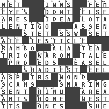 ACROSS 1. Remaining after all deductions 4. Taverns 8. Opposite of masc. 11. Snake ____ (dice throw) 13. Do not 14. Otherwise 15. Ancient Greek god of war 16. The main thing one is thinking about 17. Globular water bottle used in Asia 18. Small, flat, pigmented spot on the skin 21. NE Netherlands city 22. Proofreading order 23. Compass dir. 25. Arrange properly for use 26. Had dinner 29. One of the two male reproductive glands 32. Role for Stallone 34. Chicken ___ king 35. Afternoon social gathering 38. Musical group of three 39. Make _____ (do battle with) 41. Falsehood 43. Adept person 44. Begley and Asner 45. Artist's stand 46. Most dubious of character or honesty 50. Snakelike fish 51. Cleo's killer 54. Big collection agency 55. Words to Nanette 57. Fraudulent business schemes 59. Catching in a trap 63. Emitted 64. Tall New Zealand timber tree 67. Length times width 68. Pismires 69. Dwelling 70. A home for chicks 71. It is 72. Singles 73. A female animal or person DOWN 1. Actress Patricia 2. Jane of fiction 3. Adolescent 4. Foolish or stupid persons 5. Lower and raise head in agreement 6. Compass dir. 7. R.R. building 8. Soft thread for cleaning between teeth 9. First name in cosmetics 10. Intended 12. Fast planes 14. Raised railways 19. "Tell ____ the Marines!" 20. Unit of force equal to gravity 21. Leather borer 23. Grain storage tower 24. Skim 26. Tate display 27. Canvas cover 28. Independent ruler or chieftain 30. Tarsus (plural) 31. Singer James 33. Scornful sounds 36. Comfort 37. Toward shelter 39. Erode 40. Does sums 42. Pipe bend 45. Inactive volcano in Sicily 47. Part of HMS, perhaps 48. Follows as a consequence or result 49. Male offspring 51. Slender Brazilian palm 52. Odor 53. Leg coverings 56. NW Algerian seaport 58. Mountains (abbr.) 60. Angers 61. Tender 62. Yard entry 64. 17th letter of the Greek alphabet 65. Electrically charged atom 66. Madame (abbr.)