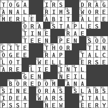 ACROSS 1. Ancient Roman robe 5. Big collection agency 8. To be drawn or hauled along 12. Of or related to the anus 13. Basketball hoops 15. Had on 16. Haggard of country music 18. "This won't hurt ____!" 19. Toward shelter 20. Mouth or opening 22. Paper fasteners 24. Prong on a fork 26. Actress Charlotte 27. Adolescent 28. Fenced enclosure 29. "Barney Miller" actor Jack 32. Quote 35. Son of Odin 37. Metal container 38. Double curve, resembling the letter S 39. Hit sharply and swiftly 40. Baby powder 41. Car dealer's back yard 42. Water source 43. Celtic language 44. "We ___ not amused" (Victoria) 45. Whopper 46. International (abbr.) 49. Commissioned military rank (abbr.) 50. Famous astronaut Armstrong 51. Mood resulting from idleness 55. Santa ___, CA 56. Trig term 57. Mouths or openings 59. Broad, flat, thick pieces 63. The main thing one is thinking about 64. Armed conflicts 65. Slanted text style (abbr.) 66. Inconspicuous attention getter 67. ___ Haven, CT 68. Suggestive of the supernatural DOWN 1. Scottish cap 2. Single 3. Slender fish 4. One to whom something is allotted 5. Retirement account (abbr.) 6. Chest bones 7. Stricken, poetically 8. A sleeping potion; an opiate (poet.) 9. Hero or heavy, e.g. 10. Ancient Greek god of war 11. Unit of force equal to gravity 14. A viewer who gazes fixedly 17. 4th largest of the Great Lakes 21. A saturated hydrocarbon 23. Baking dish 25. Main course 28. Cotton for raincoats, e.g. 29. Play the lead 30. Petroleums 31. Single time 32. Root beer relative 33. Russian composer Stravinsky 34. Wig 36. Actor Linden 40. Copy Pinocchio 42. Light entry point 45. Area sheltered from the wind 47. Teachers' org. 48. Canisters 49. Relatively large 51. Auction offers 52. Singles 53. Northwest Algerian city 54. Female horse 56. Small drink 58. Compass dir. 60. Had dinner 61. Long, evenly shaped piece 62. Mischievous