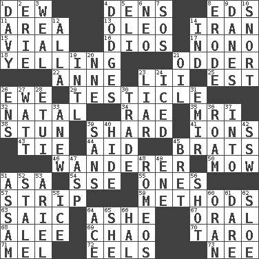 ACROSS 1. Morning condensation 4. Hiding places for outlaws 8. Begley and Asner 11. Length times width 13. Butter sub 14. SW Asia republic 15. Small bottle 16. "Vaya con ____" 17. Words to Nanette 18. Crying or shouting loudly 21. More peculiar 22. Queen of England 1702-14 23. Cards in a Roman deck? 25. Eastern Standard Time (abbr.) 26. She-sheep 29. A testis 32. Brizilian seaport 34. Actress Charlotte 35. Medical imaging device (abbr.) 38. Make senseless or dizzy 39. Pottery fragment 41. Charged particles 43. Standoff 44. Assist 45. Naughty children 46. Roamer 50. Cut the grass 51. White ___ sheet 54. Compass dir. 55. Washington bills 57. Empty completely 59. Modes 63. Ketch in the Levant 64. American tennis player Robert 67. Taken by mouth 68. Toward shelter 69. US Secretary of Labor Elaine L. _ 70. Edible starchy tuberous root 71. Cartoonist voice _ Blanc 72. Snakelike fish 73. Born DOWN 1. American folk hero Crockett 2. One of the Great Lakes 3. Welt 4. Evades 5. Connecticut Ivy Leaguer 6. Modern: prefix 7. Distress signal 8. Wear away 9. Natives or inhabitants of Denmark 10. Derisive sound 12. Silent film actress Nazimova 14. Indiana (abbr.) 19. International (abbr.) 20. Compass dir. 21. Lubricate 23. One who doesn't tell the truth 24. On the rocks 26. Followers of ems 27. Electrical Unit 28. Needle holder 30. Exchange 31. Independent ruler or chieftain 33. Afresh 36. Wander aimlessly 37. To the inside or interior of 39. Without 40. Flintstone garb 42. Compass dir. 45. Cy Young winner Saberhagen 47. Viper 48. Lover boys 49. Compass dir. 51. Indian state 52. Lacking originality or spontaneity 53. Satellite of Uranus 56. Guess 58. Frozen water 60. NW Algerian seaport 61. Have the gumption 62. _ gin 64. Adept person 65. A female animal or person 66. Actor Linden