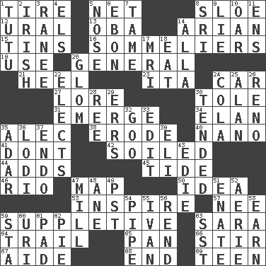 ACROSS 1. Hoop that covers a wheel 5. Remaining after all deductions 8. A type of plum 12. Mountain range 13. Chief or king in Benin or Nigeria 14. Believer in; advocate of (suffix) 15. Airtight sealed metal containers 16. Wine waiters 19. Purpose 20. Commissioned military rank 21. Person who is morally reprehensible 23. Call ___ day 24. 4-wheeled motor vehicle 27. Old wives' tales, e.g. 30. Lacquered or enameled metalware 31. Develop 34. Flair 35. Actor Baldwin 38. Eat (away) 40. Billionth: prefix 41. Do not 42. Dirtied 44. Sums up 45. Event that recurs at intervals 46. River (Sp.) 47. Atlas unit 50. It may be bright or harebrained 53. Motivate 57. Born 59. Supplying deficiencies 63. "Two Mules for Sister ____" 64. Get behind 65. Baking dish 66. Use a swizzle stick 67. Assistant 68. Conclusion 69. Adolescent DOWN 1. Ballerina skirt 2. From or relating to Ireland 3. The wife of a rajah (variant) 4. Raised railways 5. Olfactory organ 6. Inky black, to poets 7. Not wild 8. Indian title of respect (Mr.) 9. Whopper 10. Rowing implement 11. Followers of ems 14. Silent film actress Nazimova 17. Medical imaging device (abbr.) 18. Consume 20. Take by theft 22. Opts 24. Root beer relative 25. Actor Alda or Thicke 26. Western Nevada city 28. To riddle 29. Blunders 30. Looked after 32. Thick or sticky substance 33. Prepare for publication 35. The sixth month of the Jewish calendar 36. Farming town in central California 37. Inside; within (prefix) 39. Connecticut Ivy Leaguer 43. Singer Brickell 47. Place where flour is made 48. One (Scot) 49. Pacific Standard Time (abbr.) 51. Related on the mother's side 52. Nest on high 54. Corncob 55. "Terrible" tsar 56. Tear apart 58. Merit 59. R.R. building 60. RI univ. 61. Writing tablet 62. Sliced dessert 63. Fast jet (abbr.)