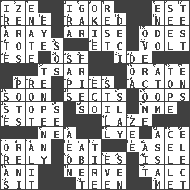 ACROSS 1. Ending with capital 4. Composer Stravinsky 8. Eastern Standard Time (abbr.) 11. French philosopher Descartes 13. Moved through 15. Born 16. Like ___ of sunshine 17. Get up 18. Lyric poems 19. Lugs 21. And so on (abbr.) 22. Electrical Unit 23. Compass dir. 24. Order of Saint Francis (abbr.) 27. Binary compound 29. Russian ruler of old 30. Declaim 34. Before (prefix) 36. Sliced desserts 39. 13-14th century defensive garment 40. Within a short period 41. Religious groups 43. I made a mistake 44. Discontinues 46. The visible part of the earth's surface 47. Madame (abbr.) 48. First name in cosmetics 49. Goldbrick 51. Teachers' org. 53. Potassium hydroxide 54. Adept person 57. NW Algerian seaport 60. Erode 63. Artist's stand 65. Trust 66. Off-Broadway awards 69. Small island 70. Cuckoo 71. Effrontery 72. Baby powder 73. Be seated 74. Adolescent 75. Was introduced to DOWN 1. Feeling or showing extreme anger 2. Nothings 3. Related on the mother's side 4. Lyricist Gershwin 5. Slender fish 6. Migrant worker of the '30s 7. Remainder 8. Inside; within (prefix) 9. Stitch closed the eyes of (a falcon) 10. Trial 12. Sight organ 14. Tenth: prefix 18. Conquer 20. Distress signal 25. Plant excrements 26. Strips of potato fried in deep fat 28. ___ good deed 29. 3-inch nail 31. Smallest unit of an element 32. Drink excessively 33. Followers of ems 34. Plant holders 35. Carrot, for example 37. Environmental prefix 38. Not moving 40. Compass dir. 42. Kill 45. Perceive with the eye 50. Last letter of the English alphabet 52. Period of immesurable duration 54. Indian state 55. Cell (Danish) 56. Choose 57. Mouths or openings 58. Painter Guido (1575-1642) 59. Came down and settled, as after flight 61. Collude with 62. Become fatigued 64. Small island 67. Night before a holiday 68. Elected rep.