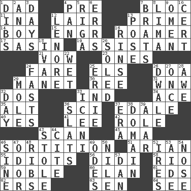 ACROSS 1. June honoree 4. Before (prefix) 7. Coalition 11. _ tizzy (2 wds.) 12. Den 13. A-one 14. Male child 15. Engineer (abbr.) 16. Wanderer 17. Indian antelope 19. Helper 21. Promise 23. Washington bills 24. Conductor's collection 25. Raised railways 26. ___ good deed 29. French painter Edouard 30. To separate or throw off 31. Compass dir. 32. Two (Sp.) 33. Indiana (abbr.) 34. Adept person 35. Keyboard modifier key 36. _-fi 37. Peak District village in England 40. It is so 41. Area sheltered from the wind 42. Hero or heavy, e.g. 43. Examine hastily 45. Nanny (var.) 46. Drawing lots 51. Believer in; advocate of (suffix) 55. Foolish or stupid persons 56. "You Light Up My Life" star Conn 58. River (Sp.) 59. Having high moral qualities 60. Style 61. Begley and Asner 62. Celtic language 63. Elected rep. 64. Observe DOWN 1. Rights 2. Small Philippine buffalo 3. 24-hour periods 4. Baking dish 5. Port city in Latvia 6. Blunders 7. Naughty children 8. Pale green bean 9. Presage 10. Foregone conclusion 12. Poe poem 13. Airs 16. Remove soap 18. "Terrible" tsar 20. Having a sole or soles 22. Dripping 24. Goes without food and/or water 25. Bert's buddy 26. A sleeping potion; an opiate (poet.) 27. At one time in the past 28. Deep reverence 29. Undercover agent 32. 24 hours 33. Ancient Celtic tribe of eastern Britain 36. Narrow boards 37. Period 38. Kingdom 39. Having or resembling wings 43. Took without asking 44. Quote 46. Trig term 47. Aroma 48. Chest bones 49. Lyric poems 50. "Death on the ____" 52. Angers 53. Helper 54. Olfactory organ 57. One of the 12 tribes of Israel