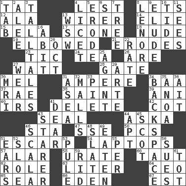 ACROSS 1. Make lace 4. For fear that 8. Allows 12. Chicken ___ king 13. One who wires 14. Writer Wiesel 15. Actor Lugosi 17. Biscuitlike quick bread 18. Naked 19. Shoved, as through a crowd 21. Eats (away) 23. Nervous spasm 24. Beverage made from leaves 26. "We ___ not amused" (Victoria) 27. Electrical Unit 28. Yard entry 30. Cartoonist voice _ Blanc 31. Electrical Unit 34. Sound made by sheep 37. Actress Charlotte 38. Inhabitant of Heaven 39. Black tropical American cuckoo 40. Big collection agency 41. Keyboard key 42. Small bed 43. Lick closed 44. "____ silly question..." 46. R.R. building 47. Compass dir. 50. Personal Computers (abbr.) 51. Fortification 54. Portable computers 57. Having or resembling wings 58. A salt of uric acid 60. Tense 62. Hero or heavy, e.g. 63. 61 cubic inches 64. Corporate head (abbr.) 65. Shrivel 66. Paradise 67. Eastern Standard Time (abbr.) DOWN 1. Bar bill 2. Toward shelter 3. Baron Munchausen's specialties 4. It is permitted: Lat. 5. Wear away 6. Elected rep. 7. Relationship diagram 8. Poe poem 9. Dodge 10. Periodic rise and fall of the sea level 11. Perceives with the eye 13. Compass dir. 16. "This won't hurt ____!" 20. Sep. follower 22. Pace 25. Rep 27. Put on (as clothing) 29. Johnson of "Laugh-In" 30. Medical imaging device (abbr.) 31. Toward the sea 32. Promenades 33. Sliced dessert 34. Keyboard key 35. Small Philippine buffalo 36. Small island 41. Letter starter 43. A viewer who gazes fixedly 44. Fitting 45. Highlander 46. Any of the three canals of the cochlea 48. Schedule 49. Ingested 51. Hearing organs 52. A type of plum 53. Whine 55. For each 56. Takes to court 59. To free from 61. Small child