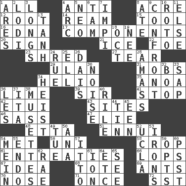ACROSS 1. 100% 4. Against 8. 43,560 square feet 12. Carrot, for example 14. 480, 500 or 516 sheets of paper 15. Implement 16. Pulitzer Prize-winning author Ferber 17. Pieces 20. Public display of a written message 21. Frozen water 22. Enemy 23. Fragment 27. Pull into pieces 29. Uhlan (variant) 31. Crowds into 34. Sun: prefix 35. Small Philippine buffalo 36. Citrus frut 39. Title for a knight 41. Constrict 42. Needle holder 43. Locates 46. Backtalk 47. Writer Wiesel 48. Singer James 51. World-weariness 54. Was introduced to 56. Corn or form start 58. Riding implement 61. Pleas 66. Chops off 67. The main thing one is thinking about 68. Carry 69. Pismires 70. Sense of smell 71. Single time 72. Fast jet (abbr.) DOWN 1. Ancient Greek god of war 2. Farming town in central California 3. Yearns 4. Curve 5. Modern: prefix 6. Scottish cap 7. Body of Kaffir warriors 8. Had dinner 9. Meet 10. Printing process, for short 11. Otherwise 13. Hyperbolic tangent 18. Sep. follower 19. Born 24. Regret 25. Pipe bend 26. Raised platform 28. Collect or gather 30. Annoying sound 32. Sometimes accompanies a hiss 33. Plant excrement 34. Robbery 36. French article 37. Call ___ day 38. French bagpipes 40. Cause heat under the collar 44. Shallow baking pan 45. Car or cant ending 49. Third day of the wk. 50. Santa ___, CA 52. Southern CA. univ. 53. Metal shackles 54. Count _ (2 wds.) 55. Inside; within (prefix) 57. "Tell ____ the Marines!" 59. Elects 60. Inconspicuous attention getter 62. Actress Charlotte 63. Electrically charged atom 64. And so on (abbr.) 65. Perceive with the eye