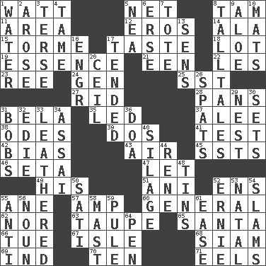 ACROSS 1. Electrical Unit 5. Fish or hair follower 8. Scottish cap 11. Type of rug 12. Greek god of love 14. According to 15. Singer Mel 17. Clothes sense 18. Car dealer's back yard 19. Center 21. Car or cant ending 22. French article 23. To sift 24. Commissioned mil. rank 25. Fast jet (abbr.) 27. To free from 28. Zero-star reviews 31. Actor Lugosi 35. Directed 37. Toward shelter 38. Lyric poems 39. Two (Sp.) 41. Trial 42. Prejudice 43. Wind 45. Fast planes 46. Bristle 47. Allow 49. Part of HMS, perhaps 51. Cuckoo 52. Followers of ems 55. A saturated hydrocarbon 57. Electrical Unit 60. Commissioned military rank 62. Not either 63. Grayish beige 65. Before Barbara or Clara 66. Third day of the wk. 67. Small island 68. Thailand, formerly 69. Working for oneself (abbr.) 70. "___ Little Indians" 71. Snakelike fish DOWN 1. Wetness 2. Came up 3. Laconic 4. Not wild 5. Teachers' org. 6. Celtic language 7. Carryall 8. Baron Munchausen's specialties 9. Medicinal plant 10. Floor protectors 13. Elected reps. 16. Engineer (abbr.) 17. Watched over 20. To provide with a ceiling 26. Arguments over trivial matters 29. Egg locale 30. Puts into a specified state 31. Moves up and down 32. Singer Brickell 33. Resembling or made to resemble leather 34. Slender Brazilian palm 36. ___ good deed 40. Fodder prepared in a silo 44. French philosopher Descartes 48. Metal containers 50. Suttee (variant) 52. Bert's buddy 53. Relating to or accompanying birth 54. Hits or strikes with great force 55. Opposed to 56. Part of speech 58. Vertical spar for supporting sails 59. Whimper 61. Relaxation 64. Animal enclosure