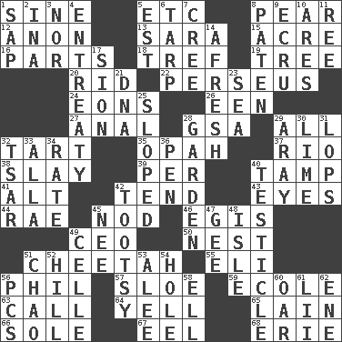ACROSS 1. Trig term 5. And so on (abbr.) 8. Lightbulb-shaped fruit 12. At once, immediately (arch.) 13. "Two Mules for Sister ____" 15. Measure of real estate 16. Actors' quests 18. Unclean, religiously 19. Woody plant 20. To free from 22. Son of Zeus who helped slay Medusa 24. Immeasurably long periods of time 26. Car or cant ending 27. Of or related to the anus 28. Girls' org. (abbr.) 29. 100% 32. Small pie 35. Brightly colored fish 37. _ de Janeiro 38. Kill 39. For each 40. Pack (down) 41. The first octave above the treble staff 42. Watch over 43. Snake ____ (dice throw) 44. Actress Charlotte 45. Allow head to fall sleepily 46. Armor plate that protects the chest 49. Corporate head (abbr.) 50. Egg locale 51. Leopard's kin 55. Connecticut Ivy Leaguer 56. Silvers or Donahue 57. _ gin 59. Learning spot: Fr. 63. Give a ring to 64. Shout 65. (Had) reclined 66. Not divided or shared with others 67. Snakelike fish 68. One of the Great Lakes DOWN 1. Plant excrement 2. _ tizzy (2 wds.) 3. Not either 4. Plea 5. Eastern Standard Time (abbr.) 6. Canvas cover 7. Algonquian 8. Eucharist need 9. Shade of tan 10. Ancient Greek god of war 11. To riddle 14. Anew 17. The Jewish people; Israel 21. Heredity factor (abbr.) 23. Ocean 25. Slanted 28. Place where plants grow 29. Like ___ of sunshine 30. Citrus frut 31. Chops off 32. Russian ruler of old 33. Silent film actress Nazimova 34. Pace 36. Animal enclosure 40. One of the two male reproductive glands 42. A girl or young woman (variant) 45. Born 47. Turn to the right 48. Small island 49. Cell (Danish) 51. US Secretary of Labor Elaine L. _ 52. Land elevation 53. Toward shelter 54. Opening into or through something 56. Personal Computers (abbr.) 58. Pipe bend 60. Boat paddle 61. Cards in a Roman deck? 62. Compass dir.