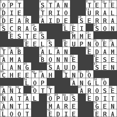 ACROSS 1. Choose 4. Comedian Laurel of Laurel & Hardy 8. Wig 12. Pass on 13. Musical group of three 14. Mountain range 15. Letter starter 17. Assistant 18. Father Junipero _ 19. Strangle with an iron collar 21. Flowery wreath 23. Boy, to dad 24. _____ Park, CO 26. Madame (abbr.) 28. Snakelike fish 30. Normal relaxed breathing 34. Bar bill 37. Actor Alda or Thicke 39. Dutch treat 40. Nanny (var.) 41. Child's nurse 43. Compass dir. 44. Long (Scottish) 46. Saudi Arabian king (1953-1964) 47. Elected rep. 48. Leopard's kin 51. Southeast Asian peninsula 54. Chop off 55. White American of non-Hispanic descent 58. Cuckoo 61. Baseball player Mel 63. Came up 65. Relating to or accompanying birth 67. Musical composition 71. Prepare for publication 72. Opposed to 73. Female horse 74. Commissioned military rank (abbr.) 75. Plunder 76. Singer Brickell 77. Epoch DOWN 1. Probability 2. Part 3. Separates forcefully 4. R.R. building 5. Three (prefix) 6. Assist 7. Christmas carol 8. Third day of the wk. 9. Blunders 10. Pacific island yam 11. Flair 16. Pace 18. Simple or foolish person 20. Turn to the right 22. Australian flightless bird 25. Broad, flat, thick piece 27. Compass dir. 29. Make a splashing sound 30. World-weariness 31. Lyric poems 32. Comfort 33. So be it 34. Baby powder 35. Nursemaid 36. Object of repulsion 38. Santa ___, CA 42. Pulitzer Prize-winning author Ferber 45. Set 49. Instrument 50. Fitting 52. Heredity factor (abbr.) 53. Legendary monster 56. Inn 57. Flexible twig of a willow tree 58. Of or related to the anus 59. Billionth: prefix 60. "Tell ____ the Marines!" 62. Heavy book 64. Inactive volcano in Sicily 66. Small island 68. Writing tablet 69. RI univ. 70. Perceive with the eye
