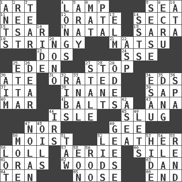 ACROSS 1. Tate display 4. Desk light 8. Ocean 11. Born 12. Declaim 14. Religious group 15. Russian ruler of old 17. Brizilian seaport 18. "Two Mules for Sister ____" 19. Slender, wiry 21. Taiwanese island in East China Sea 23. Two (Sp.) 24. Compass dir. 25. Locale of original sin 27. Discontinue 30. Had dinner 31. Declaimed 34. Begley and Asner 37. Call ___ day 38. Silly 39. Plant excrement 40. Spoil 41. Greek mezzo-soprano Agnes 43. Santa ___, CA 44. Small island 45. A hard, heavy blow 47. And not 49. Turn to the right 50. Damp 52. Cordwainer's material 56. Hang loosely or laxly 57. Nest on high 60. Drop; flow; fall 61. Mouths or openings 62. Forest 63. One of the 12 tribes of Israel 64. Nine, plus one 65. Olfactory organ 66. Conclusion DOWN 1. Pismires 2. Take ten 3. Pull apart 4. Yearns 5. Like ___ of sunshine 6. Floor covering 7. Parent Teacher Association (abbr.) 8. Gospel singer Marvin 9. Shade of tan 10. "One Day ___ Time" 13. Shade tree 14. Fast planes 16. Travel on or in a vehicle 20. Words to Nanette 22. Viper 25. Singer James 26. Letter starter 27. Lacking originality or spontaneity 28. Portable shelter 29. Lyric poems 30. Direct toward a target or goal 32. Chest bones 33. Of or related to the anus 34. He sold his birthright 35. Mild oath, euphamism for damn 36. Health resort 42. At sea 44. Big collection agency 46. Allows 47. Pitcher Ryan 48. Petroleums 49. Honkers 50. Greater amount 51. The 23rd letter of the Hebrew alphabet 52. Flaplike coverings 53. Flintstone garb 54. Flair 55. Tear apart 56. Car dealer's back yard 58. A really long time 59. Friend of Pooh