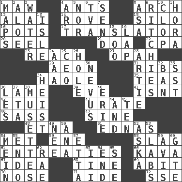 ACROSS 1. Informal term for the mouth 4. Pismires 8. Bowlike part 12. Jai _ 14. Be footloose 15. Grain storage tower 16. Plant holders 17. Interpreter 20. Sew up the eyelids of hawks and falcons 21. ___ good deed 22. Tax preparer (abbr.) 23. Arrive at 27. Brightly colored fish 29. Period of immesurable duration 31. Teases 34. White Person, in Hawaii 35. Beverages made from leaves 36. Unable to walk 39. First lady 41. Is not 42. Needle case 43. A salt of uric acid 46. Backtalk 47. Trig term 48. Inactive volcano in Sicily 51. Ferber et al. 54. Was introduced to 56. Compass dir. 58. Volcanic refuse 61. Pleas 66. Polynesian shrub of the pepper family 67. The content of cognition 68. Prong on a fork 69. "This won't hurt ____!" 70. Olfactory organ 71. Assistant 72. Compass dir. DOWN 1. Atlas contents 2. Medicinal plant 3. Wetness 4. Tate display 5. Not either 6. Federal power corp. 7. Transmit 8. White ___ sheet 9. Actors Guy, Robert Welles, and Clint 10. Hoof sound 11. Israeli folk dance 13. Capri or Wight 18. "Barney Miller" actor Jack 19. Infant locale 24. Auto club (abbr.) 25. Corporate head (abbr.) 26. Opening into or through something 28. Nick name for Arthur 30. Congenital growth or mark on the skin 32. Forbid 33. Fast jet (abbr.) 34. Robbery 36. French article 37. "One Day ___ Time" 38. French bagpipes 40. 4th largest of the Great Lakes 44. Plus 45. Nine, plus one 49. Born 50. Santa ___, CA 52. "____ silly question..." 53. Thick slices 54. Chow _ 55. Inside; within (prefix) 57. Singer James 59. Advice 60. Yard entry 62. Actress Charlotte 63. One more than two 64. Conclusion 65. Perceive with the eye