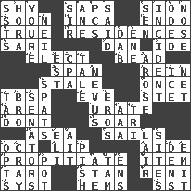 ACROSS 1. Like a shrinking violet 4. Plant excrements 8. The Jewish people; Israel 12. Within a short period 14. South American Indian 15. Inside; within (prefix) 16. Loyal 17. Dwellings 20. Indian skirt 21. Daniel's nick name 22. Binary compound 23. Choose 27. Necklace unit 29. Connect, as a bridge 31. It's straight from the horse's mouth 34. Lacking originality or spontaneity 35. At one time in the past 36. Cook's measure (abbr.) 39. Night before a holiday 41. Proofreading order 42. Type of rug 43. A salt of uric acid 46. Do not 47. Fly high 48. Toward the sea 51. Travels by water 54. Sep. follower 56. Mouth edge 58. Helper 61. Conciliate 66. A distinct part 67. Pacific island yam 68. Comedian Laurel of Laurel & Hardy 69. Painter Guido (1575-1642) 70. System (abbr.) 71. Cloth borders 72. Fast jet (abbr.) DOWN 1. Fast planes 2. Israeli folk dance 3. You are 4. Title for a knight 5. A saturated hydrocarbon 6. Personal Computers (abbr.) 7. Stated 8. Elected rep. 9. Event 10. Wrote a lyric poem 11. Characteristic smell of wine 13. Famous astronaut Armstrong 18. Apply (a substance) by light strokes 19. Compass dir. 24. Eastern Standard Time (abbr.) 25. Numbers guy (abbr.) 26. Lie 28. Came up 30. Congenital growth or mark on the skin 32. Frozen water 33. Fish or hair follower 34. Arguments over trivial matters 36. Small amount or degree 37. Sis' sibling 38. Elected representatives 40. Greek god of love 44. American Automobile Association (abbr.) 45. Three (prefix) 49. Connecticut Ivy Leaguer 50. Small island 52. Den 53. Settings 54. Elects 55. Supercomputer manufacturer 57. Expression of disdain 59. Lairs 60. Give off 62. Plant holder 63. Had dinner 64. Scottish cap 65. Followers of ems