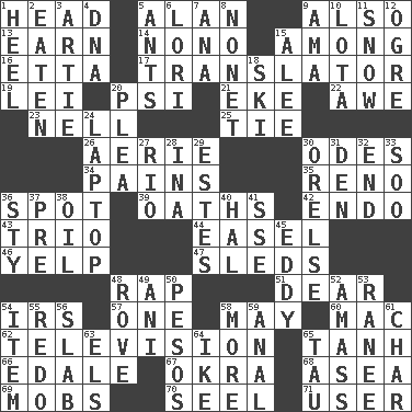 ACROSS 1. Froth on beer 5. Actor Alda or Thicke 9. In addition 13. Merit 14. Words to Nanette 15. Amid 16. Singer James 17. Interpreter 19. Flowery wreath 20. Air pressure measure (abbr.) 21. Supplement with great effort 22. Deep reverence 23. 1994 drama film starring Jodie Foster 25. Neckwear 26. Nest on high 30. Lyric poems 34. Aches 35. Former U.S. Attorney General Janet 36. Blemish 39. Curses 42. Inside; within (prefix) 43. Musical group of three 44. Artist's stand 46. Sharp bark 47. Bobsleighs 48. Reproach for some lapse or misdeed 51. Letter starter 54. Big collection agency 57. Single 58. Fifth month 60. Apple computer (short form) 62. Boob tube 65. Hyperbolic tangent 66. Peak District village in England 67. Gumbo ingredient 68. At sea 69. Crowds into 70. Sew up the eyelids of hawks and falcons 71. One who makes use of a thing DOWN 1. The bottom of a shoe or boot 2. Consumed 3. Nick name for Arthur 4. Heredity factor (abbr.) 5. Pismires 6. Australian parrot (variant) 7. Santa ___, CA 8. Music written for nine 9. Nanny (var.) 10. Globular water bottle used in Asia 11. Overwhelm 12. Legendary monster 15. Toward shelter 18. What Jean-Claude Killy likes to do 20. Entreaty 24. Portable computer 27. _ de Janeiro 28. _ tizzy (2 wds.) 29. _____ Park, CO 30. Threatening words 31. Lair 32. Conclude 33. "Barney Miller" actor Jack 36. Filthy place 37. Before (prefix) 38. Petroleum 40. Actor Linden 41. Compass dir. 45. Whirlpool 48. Be footloose 49. Cuckoo 50. Mexican monetary units 52. Collect or gather 53. Indian princess (variant) 54. A whole individual unit 55. Do over again 56. Broad, flat, thick piece 58. Greater amount 59. Of or related to the anus 61. Burn to charcoal 63. Raised railways 64. D.D.E's nickname 65. The 19th letter of the Greek alphabet