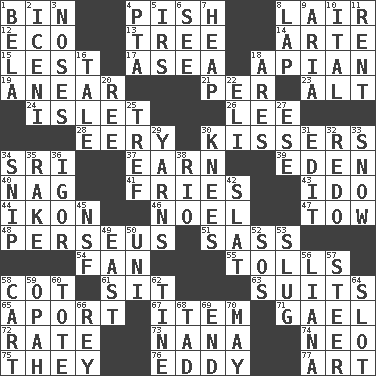 ACROSS 1. Storage container 4. Expression of disdain 8. Den 12. Environmental prefix 13. Woody plant 14. Johnson of "Laugh-In" 15. For fear that 17. Toward the sea 18. Bee-related 19. Approach 21. For each 23. The first octave above the treble staff 24. Small island 26. Area sheltered from the wind 28. Suggestive of the supernatural 30. Smoochers 34. Indian title of respect (Mr.) 37. Merit 39. Locale of original sin 40. Tired old horse 41. Strips of potato fried in deep fat 43. Wedding promise 44. Picture 46. Christmas carol 47. Pull behind 48. Son of Zeus who helped slay Medusa 51. Backtalk 54. Air blower 55. For Whom the Bell _____ 58. Small bed 61. Be seated 63. Costumes for special activities 65. To the left, to Queeg 67. A distinct part 71. Highlander 72. Pace 73. Grandmother 74. Modern: prefix 75. Those people 76. Whirlpool 77. Tate display DOWN 1. Actor Lugosi 2. Ancient Celtic tribe of eastern Britain 3. Olfactory organs 4. Parent Teacher Association (abbr.) 5. Big collection agency 6. Observe 7. Pile 8. Pet locale 9. Operatic vocal solo 10. Slanted text style (abbr.) 11. Monthly bill 16. Falsehood 18. Ancient Greek god of war 20. Portuguese money of account (variant) 22. Biblical high priest 25. Not kosher 27. Compass dir. 29. Tall tales 30. Leg joints 31. Prepare for publication 32. Redecorate 33. Overwhelm 34. Sever or remove by pinching or nipping 35. Immoral or dissolute person 36. Composer Stravinsky 38. River (Sp.) 42. Narrow board 45. Science/research agcy. 49. Compass direction 50. Single; one (prefix) 52. Distress signal 53. Snaillike creature with no shell 56. Climbing, woody, usually tropical vines 57. Navigate 58. Heavy open wagon 59. Brightly colored fish 60. Carryall 62. Prong on a fork 64. Notch 66. Marina Del _, California 68. Small boy 69. Conclusion 70. Fifth month
