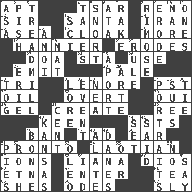 ACROSS 1. Fitting 4. Russian ruler of old 8. San ____ (Riviera town) 12. Title for a knight 13. Before Barbara or Clara 14. SW Asia republic 15. At sea 17. Hide under a false appearance 18. Greater amount 19. More given to overacting 21. Eats (away) 23. ___ good deed 24. R.R. building 26. Purpose 27. Give off 28. Light colored 30. Three (prefix) 31. Poe poem 34. Pacific Standard Time (abbr.) 37. Lubricate 38. Unconcealed 39. Fr. "Yes" 40. Set 41. Make 42. Portuguese money of account (variant) 43. Peachy ____! 44. Fast planes 46. Prohibit 47. Small boy 50. Ewer handle 51. Right away 54. Of or relating to Laos or its people 57. Charged particles 58. Woody, climbing, usually tropical plant 60. "Vaya con ____" 62. Inactive volcano in Sicily 63. Keyboard key 64. Beverage made from leaves 65. "______ My Girl" (Turtles hit) 66. Lyric poems 67. Roguish DOWN 1. White ___ sheet 2. Expression of disdain 3. Excercise machine 4. Stories 5. Derisive sound 6. "One Day ___ Time" 7. Libertine 8. Full of chinks, cracks, or crevices 9. Eat (away) 10. Female horse 11. Singles 13. _-fi 16. Mine, in Marseilles 20. Floor covering 22. Court order 25. To the left, to Queeg 27. One of the Great Lakes 29. Johnson of "Laugh-In" 30. Coat; cloak 31. Old wives' tales, e.g. 32. Happening 33. Teachers' org. 34. Likenesses of persons 35. Takes to court 36. Neckwear 41. Penny 43. Sunflower state 44. Put into a specified state 45. Stated 46. Maid-servant 48. Having winglike extensions 49. Natives or inhabitants of Denmark 51. Sliced desserts 52. Writer of Portnoy's Complaint (1969) 53. Margarine 55. Rowing implement 56. Christmas carol 59. Working for oneself (abbr.) 61. Declare