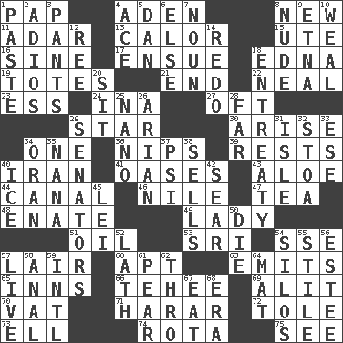 ACROSS 1. Infant food 4. Arabian gulf 8. ___ Haven, CT 11. The sixth month of the Jewish calendar 13. Bodily heat indicating an inflammation 15. Shoshoni 16. Trig term 17. Follow as a consequence or result 18. Pulitzer Prize-winning author Ferber 19. Hauls 21. Conclusion 22. Anneal 23. Curvy letter 24. _ tizzy (2 wds.) 27. Often (poetically) 29. Play the lead 30. Originate 34. Single 36. Pinches, bites 39. Musical pauses 40. SW Asia republic 41. Fertile tracts in a desert 43. Medicinal plant 44. Lessep's creation 46. "Death on the ____" 47. Afternoon social gathering 48. Maternal 49. Kenny Rogers chart-topper in '80 51. Lubricate 53. _ Lanka 54. Compass dir. 57. Den 60. Fitting 63. Sends forth 65. Restaurants 66. Giggle 69. Came down and settled, as after flight 70. Large container 71. Ethiopian city, capital of Harari 72. Lacquered or enameled metalware 73. Pipe bend 74. Roll call or roster of names 75. Observe DOWN 1. Thick mixture 2. Goodbye (Sp.) 3. Leg coverings 4. Adept person 5. One of the 12 tribes of Israel 6. Otherwise 7. Part of speech 8. Unadorned 9. Inactive volcano in Sicily 10. Welt 12. To separate or throw off 14. Do over again 18. Plea 20. Be seated 25. Billionth: prefix 26. Believer in; advocate of (suffix) 28. Distant 29. Elected representatives 31. Capri or Wight 32. Portico 33. Compass dir. 34. NW Algerian seaport 35. Nanny 37. 23rd letter of the Greek alphabet 38. Exchanges for money 40. Frozen water 42. Shrivel 45. Flowery wreath 50. Pass on 52. Thin strip of wood or metal 54. Grain storage towers 55. Vertical member of a panel or frame 56. First name in cosmetics 57. Moving, as bait 58. Of or related to the anus 59. International (abbr.) 61. Lightbulb-shaped fruit 62. Through, poetically 64. Floor protector 67. Erode 68. Period