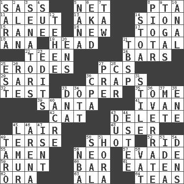 ACROSS 1. Backtalk 5. Fish or hair follower 8. Parent Teacher Association (abbr.) 11. Native American of Southwest Alaska 13. Alias (abbr.) 14. The Jewish people; Israel 15. The wife of a rajah (variant) 16. ___ Haven, CT 17. Ancient Roman robe 18. Santa ___, CA 19. Froth on beer 21. "_____ Recall" 22. Adolescent 24. Long, evenly shaped pieces 25. Eats (away) 27. Personal Computers (abbr.) 29. Indian skirt 30. Dice game 32. Trial 33. Drug addict 35. Heavy book 39. Before Barbara or Clara 41. _ the terrible 42. Domesticated feline 43. Erase 45. Den 48. One who uses or employs something 49. Laconic 50. Opportunity 52. To free from 55. So be it 56. Modern: prefix 57. Elude 59. The smallest animal of a litter 60. Oblong piece of solid material 61. Consumed 62. Mouth or opening 63. In the manner of 64. Afternoon social gatherings DOWN 1. "Two Mules for Sister ____" 2. ____ Jay Lerner 3. Legislators 4. Take to court 5. Grandmother 6. Supplemented with great effort 7. The 23rd letter of the Hebrew alphabet 8. Peter (Polish) 9. Ancient Roman robes 10. Of or related to the anus 12. Giggle 14. Portico 20. Followers of ems 21. Cook's measure (abbr.) 23. Proofreads 25. Eastern Standard Time (abbr.) 26. Actress Charlotte 27. Before (prefix) 28. 4-wheeled motor vehicle 30. Numbers guy (abbr.) 31. Vertical member of a panel or frame 33. Heredity factor (abbr.) 34. Baseball player Mel 36. Make much ado about nothing 37. Floor covering 38. Compass dir. 40. 43,560 square feet 43. Superhero pair 44. First name in cosmetics 45. Arboreal primate 46. Sports stadium 47. Is not 49. Edible starchy tuberous root 50. Lick closed 51. Israeli folk dance 53. It may be bright or harebrained 54. Lairs 56. Basketball assoc. 58. Large container