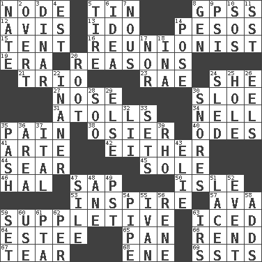 ACROSS 1. Connecting point 5. Shallow baking pan 8. Global Positioning Systems (abbr.) 12. Advice 13. Wedding promise 14. Mexican monetary units 15. Portable shelter 16. One who advocates reunion 19. Epoch 20. Thinks logically 21. Musical group of three 23. Actress Charlotte 24. A female animal or person 27. Sense of smell 30. A type of plum 31. Ringlike coral islands and reefs 34. 1994 drama film starring Jodie Foster 35. Ache 38. Flexible twig of a willow tree 40. Lyric poems 41. Johnson of "Laugh-In" 42. One or the other 44. Scorch 45. Not divided or shared with others 46. Actor Linden 47. Plant excrement 50. Capri or Wight 53. Heighten or intensify 57. Actress Gardner 59. Supplementary 63. On the rocks 64. First name in cosmetics 65. Baking dish 66. Tear apart 67. Rend 68. Compass dir. 69. Fast planes DOWN 1. Nathan's nickname 2. Unconcealed 3. Middle Eastern gold or silver currency 4. Eastern Standard Time (abbr.) 5. Become fatigued 6. It may be bright or harebrained 7. Horse sense 8. Commissioned military rank (abbr.) 9. Air pressure measure (abbr.) 10. Distress signal 11. Fast jet (abbr.) 14. Introduce or present, as a question 17. Not either 18. _ tizzy (2 wds.) 20. Carrot, for example 22. More empty; more void 24. Downhill vehicle 25. Opening into or through something 26. Snakelike fish 28. "Barney Miller" actor Jack 29. Otherwise 30. Sounds asleep 32. Cards in a Roman deck? 33. Puts into a specified state 35. Romantic infatuation 36. Type of rug 37. Slanted text style (abbr.) 39. 17th letter of the Greek alphabet 43. Writer Wiesel 47. Drop; flow; fall 48. One (Scot) 49. Pacific Standard Time (abbr.) 51. Shoestrings 52. Happening 54. Corncob 55. _ the terrible 56. French philosopher Descartes 58. Sums up 59. Put into a specified state 60. Purpose 61. Parent Teacher Association (abbr.) 62. For each 63. Big collection agency