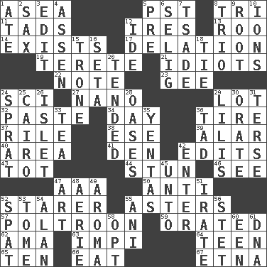 ACROSS 1. At sea 5. Pacific Standard Time (abbr.) 8. Three (prefix) 11. Small boys 12. Angers 13. Friend of Pooh 14. Is extant 17. Conveyance 19. Cylindrical with tapered ends 21. Foolish or stupid persons 22. Observe 23. Turn to the right 24. _-fi 27. Billionth: prefix 29. Car dealer's back yard 32. Thick mixture 34. 24 hours 36. Hoop that covers a wheel 37. Cause heat under the collar 38. Compass dir. 39. Having or resembling wings 40. Length times width 41. Lair 42. Proofreads 43. Small child 44. Astound 46. Observe 47. Auto club (abbr.) 50. Against 52. A viewer who gazes fixedly 55. Michaelmas daisies 57. Characterized by complete cowardliness 59. Spoke pompously 62. Housemaid (var.) 63. Body of Kaffir warriors 64. Adolescent 65. Nine, plus one 66. Consume 67. Inactive volcano in Sicily DOWN 1. Had dinner 2. Saxophone 3. Prepare for publication 4. NE Netherlands city 5. Before (prefix) 6. Former Milwaukee Brewers owner Bud 7. Sadhe (variant) 8. Musical group of three 9. Carrot, for example 10. Charged particles 12. Binary compound 15. Heavy duty weighing machine 16. Bristle 18. Neckwear 20. Looked after 24. Small fatty European fish 25. Capital of Egypt 26. Small island 28. Fertile tracts in a desert 29. Ms. Damita and namesakes 30. Declaim 31. Laconic 33. Afternoon social gathering 35. Gossips 36. Small boy 42. Keyboard key 45. To (old English) 47. Tate display 48. Nest on high 49. Odor 51. Feeling or showing extreme anger 52. Petty quarrel 53. Heavy book 54. Actor Alda or Thicke 55. Black tropical American cuckoo 56. Proofreading order 58. Elect 60. Car or cant ending 61. Heredity factor (abbr.)