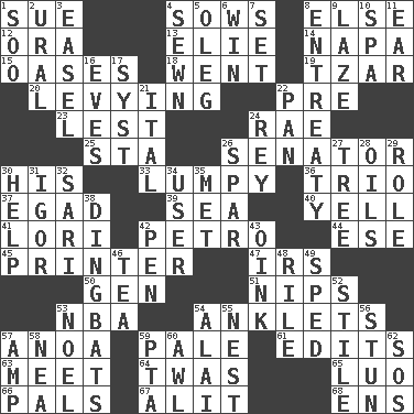 ACROSS 1. Institute legal proceedings 4. Sty mamas 8. Otherwise 12. Mouth or opening 13. Writer Wiesel 14. California wine valley 15. Fertile tracts in a desert 18. Gone 19. Russian ruler 20. Imposing or collecting, as a tax 22. Before (prefix) 23. For fear that 24. Actress Charlotte 25. R.R. building 26. Legislator 30. Part of HMS, perhaps 33. Containing lumps 36. Musical group of three 37. Mild oath 39. Ocean 40. Shout 41. Australian parrot (variant) 42. Stone: prefix 44. Compass dir. 45. Hard copy producer 47. Big collection agency 50. Commissioned mil. rank 51. Cuts off 53. Basketball assoc. 54. Short socks 57. Small Philippine buffalo 59. Diluted with white 61. Proofreads 63. Confront 64. It was, poetically 65. Nilotic language 66. Friends 67. Came down and settled, as after flight 68. Followers of ems DOWN 1. "Barney Miller" actor Jack 2. Mountain range 3. Artist's stand 4. Stitched 5. Cassini of fashion 6. Acquire through effort 7. Arrange properly for use 8. Plea 9. Goldbrick 10. Health resort 11. Ewer handle 16. Nights before holidays 17. System (abbr.) 21. Slanted text style (abbr.) 22. Baking dish 24. Marina Del _, California 26. Coast Guard woman 27. Family _ (genealogy) 28. Petroleums 29. Hero or heavy, e.g. 30. Assist 31. Composer Stravinsky 32. Indian skirt 34. One who uses or employs something 35. Was introduced to 38. Empty-headed or silly people 42. Fenced enclosure 43. Pig sound 46. Beverage made from leaves 48. Cause heat under the collar 49. Broke a traffic law 52. Vertical member of a panel or frame 53. Christmas carol 54. Jai ____ 55. Egg locale 56. Make senseless or dizzy 57. Electrical Unit 58. Teachers' org. 59. Parent Teacher Assoc. 60. Leather borer 62. Mayday