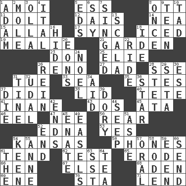 ACROSS 1. Mine, in Marseilles 5. Curvy letter 8. Baseball player Mel 11. Stupid person 12. Raised platform 14. Teachers' org. 15. Assad's deity 17. Synchronize (abbr.) 18. On the rocks 19. Ear of corn 21. Place where plants grow 23. Spanish title 25. Writer Wiesel 26. Western Nevada city 27. Male parent 28. Compass dir. 31. Third day of the wk. 33. Ocean 35. _____ Park, CO 37. "You Light Up My Life" star Conn 38. Flaplike covering 40. Wig 41. Silly 43. Two (Sp.) 45. "One Day ___ Time" 46. Snakelike fish 47. Born 50. Located in or toward the back 52. Pulitzer Prize-winning author Ferber 53. It is so 54. Sunflower state 56. Gives a jingle 61. Watch over 62. Trial 65. Eat (away) 66. Layer 67. Otherwise 68. An important port of Yemen 69. Compass dir. 70. R.R. building 71. Grant temporary use of DOWN 1. First of billions? 2. Undercover agent 3. Water jar 4. Slanted text style (abbr.) 5. Begley and Asner 6. Declare 7. Burned superficially 8. At one time in the past 9. Adolescent 10. Small boy 13. Any of the three canals of the cochlea 16. Flintstone garb 18. Binary compound 20. Immeasurably long periods of time 22. Travel on or in a vehicle 24. Christmas carol 26. It's straight from the horse's mouth 28. Proofreading order 29. Stalk of a moss capsule 30. Compass dir. 31. Prong on a fork 32. Hereditary estate 34. Assist 36. Play the lead 37. Pass on 39. Dinghy 42. Extremities 44. Ooze 48. Related on the mother's side 49. Artist's stands 51. American tennis player Robert 52. Conclude 54. Peachy ____! 55. Singer Murray 57. Spoken 58. Connecting point 59. Paradise 60. Post 61. Definite Article 63. Fast jet (abbr.) 64. Afternoon social gathering