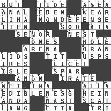 ACROSS 1. With the exception that 4. Periodic rise and fall of the sea level 8. At sea 12. Of or related to the anus 14. Genesis locale 15. Put on (as clothing) 16. Pale green bean 17. Unrelated to defense, as in spending 20. A distinct part 21. "Barney Miller" actor Jack 22. _ moment's notice (2 wds.) 23. Sir (Sp.) 27. Egg locale 29. Singles 31. Hollow 34. Sports stadium 35. Northwest Algerian city 36. Hats (slang) 39. Teat (slang) 41. United States Postal Service (abbr.) 42. Angers 43. It is permitted: Lat. 46. Small island 47. Practice fight 48. Soon (poet.) 51. Feeling or showing extreme anger 54. Soggy 56. _ tizzy (2 wds.) 58. Silent film actress Nazimova 61. The property of being fit to eat 66. Chow _ 67. Small Philippine buffalo 68. Political cartoonist Thomas 69. Scram! 70. Long (Scottish) 71. Singer James 72. Three (prefix) DOWN 1. Indonesian resort city 2. A single undivided whole 3. Domesticates 4. Nine, plus one 5. Wedding promise 6. Lair 7. Conclusions 8. Deep reverence 9. Legislators 10. Compass direction 11. Type of rug 13. Unable to walk 18. A really long time 19. Enemy 24. Not either 25. Single 26. Monthly bill 28. Yell 30. Travels by water 32. Pet locale 33. Followers of ems 34. NE Netherlands city 36. Cards in a Roman deck? 37. Big collection agency 38. Conveyance 40. Native american tent (variation) 44. Automobile 45. Epoch 49. Petroleum 50. Compass dir. 52. Scottish caps 53. Voters do this 54. Welt 55. Pulitzer Prize-winning author Ferber 57. Singer Murray 59. One who doesn't tell the truth 60. Opposed to 62. Paper or plastic container 63. Erode 64. Fast jet (abbr.) 65. R.R. building