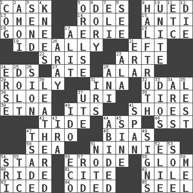 ACROSS 1. Keg 5. Lyric poems 9. Became colored 13. Sign of something about to happen 14. Hero or heavy, e.g. 15. Against 16. Went 17. Nest on high 18. Louse (plural) 19. Under perfect conditions 21. Lizard (obsolete) 22. Indian titles of respect 23. Johnson of "Laugh-In" 24. Begley and Asner 27. Had dinner 28. Having or resembling wings 29. Agitated, as a liquid 31. _ tizzy (2 wds.) 32. Hereditary estate 36. A type of plum 37. RI univ. 38. Hoop that covers a wheel 39. Inactive volcano in Sicily 40. ___ a Wonderful Life 41. Imelda's hoard 42. Event that recurs at intervals 44. Cleo's killer 46. Fast jet (abbr.) 47. Through, poetically 48. Prejudice 50. Ocean 51. Simpletons 54. Play the lead 56. Wear away 58. Seize upon or latch onto something 60. Travel on an animal 61. Quote 62. Mediterranean tributary 63. On the rocks 64. Wrote a lyric poem 65. Stitch closed the eyes of (a falcon) DOWN 1. Gear tooth 2. Mine, in Marseilles 3. Transmit 4. Leg joints 5. Threatening words 6. Dinghy 7. Biblical high priest 8. Perceive with the eye 9. Not exactly gospel 10. Join together 11. And so on (abbr.) 12. Pass on 17. Set down 20. Like ___ of sunshine 21. Period 23. According to 24. Celtic language 25. Stupid person 26. The Jewish people; Israel 28. Cuckoo 30. Resembling or made to resemble leather 31. Big collection agency 33. "Vaya con ____" 34. Ancient Greek god of war 35. For fear that 37. Shoshoni 40. Wedding promise 41. Connect, as a bridge 43. Lyricist Gershwin 44. Stayed 45. Trig term 47. Sadhe (variant) 49. Attaches a signature 51. Musical sound 52. Writer Wiesel 53. Not divided or shared with others 54. _ Lanka 55. Nervous spasm 56. Environmental prefix 57. To free from 59. Cartoonist voice _ Blanc