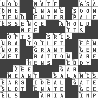 ACROSS 1. Allow head to fall sleepily 4. Nathan's nickname 8. Girls' org. (abbr.) 11. Single 12. Silly 14. Within a short period 15. Watch over 17. Keyboard key 18. Light colored 19. Substance 21. Hold, grip (Informal) 23. Born 24. It is 25. Elects 27. Indian titles of respect 30. Basketball assoc. 31. Rest room 34. Car or cant ending 37. And not 38. Monetary aid 39. Commissioned mil. rank 40. Soggy 41. Food allowance for one day 43. "We ___ not amused" (Victoria) 44. Coop moms 45. Whirlpool 47. Last letter of the English alphabet 49. Slender fish 50. Intended 52. Deli grouping 56. Hearing organs 57. Perfect 60. Yard entry 61. Slit 62. Maternal 63. Turn to the right 64. Raised railways 65. Operatic vocal solo 66. Naughty child DOWN 1. Brief written record 2. Washington bills 3. Cub Scout units 4. Sibling's daughter 5. Singer Murray 6. Make lace 7. Compass dir. 8. Purposes of endeavors 9. Disposed of to a purchaser 10. A saturated hydrocarbon 13. Epoch 14. Specific locale 16. Gouge 20. A home for chicks 22. Part of HMS, perhaps 25. Mitch Miller's instrument 26. Role in a play 27. Narrow boards 28. Painter Guido (1575-1642) 29. "Tell ____ the Marines!" 30. Compass dir. 32. Legendary monster 33. SW Asia republic 34. Mild oath 35. Suggestive of the supernatural 36. Compass dir. 42. Anneal 44. Layer 46. To trail on the ground 47. Nothings 48. 90 degrees 49. An organ shaped like a helmet 50. Shopping center 51. Make a knot 52. Suttee (variant) 53. Wise men 54. Detail 55. Ooze 56. Compass dir. 58. Heredity factor (abbr.) 59. Ewer handle