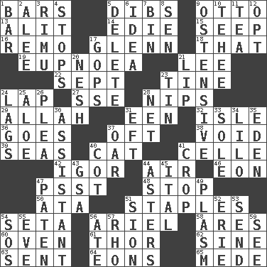 ACROSS 1. Long, evenly shaped pieces 5. Rights 9. "Beetle Bailey" pooch 13. Set down 14. Singer Brickell 15. Ooze 16. San ____ (Riviera town) 17. American astronaut and politician John 18. Not this but _ 19. Normal relaxed breathing 21. Area sheltered from the wind 22. Back-to-school mo. 23. Prong on a fork 24. Pet locale 27. Compass dir. 28. Cuts off 29. Assad's deity 31. Car or cant ending 32. Capri or Wight 36. Travels 37. Often (poetically) 38. Null 39. Oceans 40. Feline 41. Cell (Danish) 42. Composer Stravinsky 44. Wind 46. A really long time 47. Inconspicuous attention getter 48. Constrict 50. _ moment's notice (2 wds.) 51. Paper fasteners 54. Stalk of a moss capsule 56. Satellite of Uranus 58. Ancient Greek god of war 60. Baking chamber 61. Son of Odin 62. Trig term 63. Emitted 64. Immeasurably long periods of time 65. Ancient Persian DOWN 1. Soap unit 2. Toward shelter 3. Tall New Zealand timber tree 4. Discontinues 5. Keyboard key 6. The main thing one is thinking about 7. Storage container 8. Elected rep. 9. Clearly or manifestly demonstrative 10. Giggle 11. Beverage made from leaves 12. Choose 17. Republicans 20. Delicate 21. Mouth edge 23. Shallow baking pan 24. Falls behind 25. _ vera 26. Entreaty 28. Remaining after all deductions 30. Helper 31. Newt 33. Not divided or shared with others 34. _ and Stitch 35. Locale of original sin 37. Boat paddle 40. Small bed 41. Riding implement 43. Girls' org. (abbr.) 44. Michaelmas daisies 45. Slanted text style (abbr.) 47. Eucharist need 49. Suffix with ecto or cyto 51. The Jewish people; Israel 52. 4th largest of the Great Lakes 53. Post 54. Distress signal 55. Night before a holiday 56. Had dinner 57. 17th letter of the Greek alphabet 59. Perceive with the eye