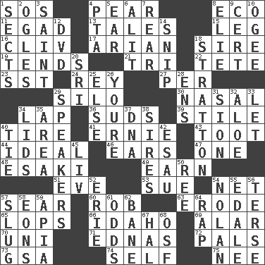 ACROSS 1. Distress signal 4. Lightbulb-shaped fruit 8. Environmental prefix 11. Mild oath 13. Lies 15. Part of a journey 16. 154 in Roman numerals 17. Believer in; advocate of (suffix) 18. The founder of a family 19. Looks after 21. Three (prefix) 22. Wig 23. Fast jet (abbr.) 24. Marina Del _, California 27. For each 29. Grain storage tower 30. Rhinal 34. Infant locale 36. Beer foam 39. Vertical member of a panel or frame 40. Become fatigued 41. Bert's buddy 43. A blast of a horn 44. Perfect 46. Hearing organs 47. Single 48. 1973 Nobel Price Winner (Physics) Leo 49. Merit 51. Night before a holiday 53. Take to court 54. Fish or hair follower 57. Scorch 60. Director Reiner 63. Eat (away) 65. Chops off 66. Potato state 69. Having or resembling wings 70. University (slang) 71. Ferber et al. 72. Friends 73. Girls' org. (abbr.) 74. Itself 75. Born DOWN 1. Religious groups 2. Stares 3. Inhabitant of Heaven 4. Parent Teacher Association (abbr.) 5. Hearing organ 6. Set down 7. Tail end 8. Writer Wiesel 9. Sure thing 10. Double curve, resembling the letter S 12. Movie disc 14. Clip 18. Ski resort town in Vermont 20. _ Lanka 25. Otherwise 26. You are 28. Followers of ems 29. Orators 31. The Jewish people; Israel 32. Medicinal plant 33. Allow 34. Hats (slang) 35. Length times width 37. Heredity factor (abbr.) 38. Fathers 40. Neckwear 42. He sold his birthright 45. 54 in ancient Rome 50. Portuguese money of account (variant) 52. One of the Great Lakes 54. Pitcher Ryan 55. Peak District village in England 56. Laconic 57. Strike heavily 58. Immeasurably long periods of time 59. Capital of Western Samoa 61. Probability 62. Object of repulsion 64. Strike 67. Actor Linden 68. Order of Saint Francis (abbr.)