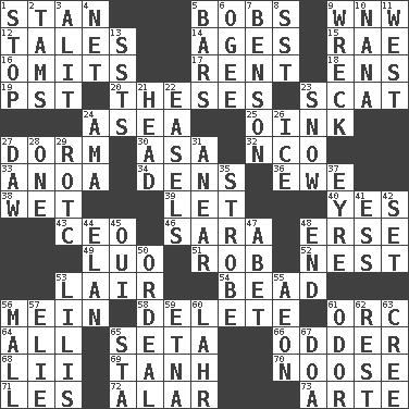 ACROSS 1. Comedian Laurel of Laurel & Hardy 5. Moves up and down 9. Compass dir. 12. Falsehoods 14. Eras 15. Actress Charlotte 16. Leaves out 17. Monthly bill 18. Followers of ems 19. Pacific Standard Time (abbr.) 20. College papers 23. Scram! 24. Toward the sea 25. Pig sound 27. Dormintory (informal) 30. White ___ sheet 32. Non-commissioned officer (abbr.) 33. Small Philippine buffalo 34. Lairs 36. She-sheep 38. Dripping 39. Allow 40. Affirmative reply 43. Corporate head (abbr.) 46. "Two Mules for Sister ____" 48. Celtic language 49. Nilotic language 51. Director Reiner 52. A home for chicks 53. Den 54. Necklace unit 56. Chow _ 58. Erase 61. The grampus (Milton) 64. 100% 65. Bristle 66. More peculiar 68. Cards in a Roman deck? 69. Hyperbolic tangent 70. Trap for birds or small mammals 71. French article 72. Having or resembling wings 73. Johnson of "Laugh-In" DOWN 1. Close up, plug up 2. Scottish caps 3. Set down 4. Fish or hair follower 5. Oblong pieces of solid material 6. Double curve, resembling the letter S 7. Gillaume's butler role 8. Fast jet (abbr.) 9. Raze 10. Nanny 11. 270 degrees 13. Fast planes 21. Froth on beer 22. Artist's stands 23. Overwhelm 24. Nursemaid (var.) 26. Frozen water 27. Obsolete 28. Single 29. College mil. group 31. Approach 35. Disco prop 37. Jane of fiction 41. Curvy letter 42. Arrange properly for use 44. Flair 45. Fr. "Yes" 47. Collude with 48. Conclude 50. Severe or trying experience 53. Ms. Damita and namesakes 55. A really long time 56. Promenade 57. Writer Wiesel 59. Inactive volcano in Sicily 60. Cowardly lion portrayer 61. Scent 62. Relief 63. Algonquian 65. R.R. building 67. ___ good deed