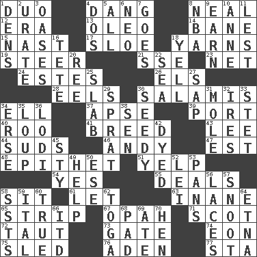 ACROSS 1. Superhero pair 4. Mild oath, euphamism for damn 8. Be tempered by heat 12. Epoch 13. Butter sub 14. Object of repulsion 15. Political cartoonist Thomas 17. _ gin 18. Tall tales 19. Guide 21. Compass dir. 23. Remaining after all deductions 24. _____ Park, CO 26. Raised railways 28. Snakelike fish 30. Deli grouping 34. Pipe bend 37. Domed church section 39. Left side of a ship or aircraft 40. Friend of Pooh 41. A special lineage 43. Area sheltered from the wind 44. Soap bubbles 46. Actor Griffith 47. Eastern Standard Time (abbr.) 48. Curse 51. Sharp bark 54. Consenting reply 55. Allots cards 58. Be seated 61. Allow 63. Silly 65. Long narrow piece of something 67. Brightly colored fish 71. Native of Scotland 72. Strained 73. Yard entry 74. Period of immesurable duration 75. Downhill vehicle 76. Arabian gulf 77. R.R. building DOWN 1. Habitations of wild animals 2. A salt of uric acid 3. Fertile tracts in a desert 4. Two (Sp.) 5. 100% 6. Modern: prefix 7. Leaves 8. Basketball assoc. 9. Merit 10. Singer Murray 11. For fear that 16. Wig 18. Shout 20. Portuguese money of account (variant) 22. Ocean 25. Thick slice 27. Plant excrement 29. Small fatty European fish 30. Morally degraded 31. Undercover agent 32. Angers 33. Proofreading order 34. Celtic language 35. Central Nebraska county 36. Farming town in central California 38. Elected rep. 42. Colored 45. Filthy place 49. Aid 50. Compass dir. 52. Flowery wreath 53. Zero-star reviews 56. Shoestrings 57. Snout, nose 58. Fast planes 59. Slanted text style (abbr.) 60. Loyal 62. Ancient Roman robe 64. Inactive volcano in Sicily 66. It would 68. Writing tablet 69. Had dinner 70. Layer