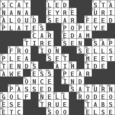 ACROSS 1. Go away! 5. Directed 8. R.R. building 11. Nanny 12. Jane of fiction 14. RI univ. 15. Verbally 17. Wither 18. Nourish 19. Food holders 21. Wimpy's pal 23. Auto 25. Dutch treat 26. Hoop that covers a wheel 27. Elected rep. 28. Plant excrement 31. From 33. Electrically charged atom 35. Makes a sale 37. Entreaty 38. Put into a specified state 40. Rendezvous 41. Is inclined (to) 43. Direct toward a target or goal 45. Binary compound 46. Deep reverence 47. Double-curved letter 50. Lightbulb-shaped fruit 52. At one time in the past 53. Working for oneself (abbr.) 54. Went by 56. Titan orbits this 61. Eighteen holes 62. 1994 drama film starring Jodie Foster 65. Cowboy competition 66. Compass dir. 67. Loyal 68. Bar bills 69. And so on (abbr.) 70. "Barney Miller" actor Jack 71. Otherwise DOWN 1. Fastener 2. Give a ring to 3. Small Philippine buffalo 4. Tense 5. French article 6. Sight organ 7. Window treatments 8. Chop _ 9. Woody plant 10. Help 13. Eat (away) 16. Tenth: prefix 18. Opposite of masc. 20. Indian skirt 22. Baking dishes 24. Vintage cars 26. Frog relative 28. Downhill vehicle 29. Toward shelter 30. Pacific Standard Time (abbr.) 31. Soared 32. French philosopher Descartes 34. Teachers' org. 36. Arab leader 37. Parent Teacher Assoc. 39. Native american tent (variation) 42. Elected reps. 44. Not women's 48. Aroma 49. Spring feasts 51. The sixth month of the Jewish calendar 52. Order of Saint Francis (abbr.) 54. Mail 55. Actor Baldwin 57. Haul 58. Freehold land 59. Confederate soldiers (slang) 60. Olfactory organ 61. Unit of force equal to gravity 63. Nilotic language 64. Lion