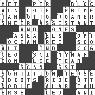 ACROSS 1. Was introduced to 4. For each 7. Coalition 11. In the manner of 12. ____ d'Azur (French Riviera) 13. A-one 14. Scottish cap 15. Von Bismarck 16. Nomad 17. Scornful expression 19. Helper 21. Plus 23. Washington bills 24. At sea 25. Raised railways 26. Elect 29. Sea 30. Portuguese money of account (variant) 31. "Barney Miller" actor Jack 32. The first octave above the treble staff 33. Indiana (abbr.) 34. Gear tooth 35. Corporate head (abbr.) 36. _-fi 37. Non-adult bird? 40. A really long time 41. Area sheltered from the wind 42. Lacerate 43. Examine hastily 45. Fast jet (abbr.) 46. Decision 51. Laconic 55. Foolish or stupid persons 56. Travel on an animal 58. Baseball player Mel 59. Impressive in appearance 60. Having or resembling wings 61. The 19th letter of the Greek alphabet 62. Celtic language 63. Directed 64. Cuckoo DOWN 1. Floor coverings 2. Enthusiasm 3. Not wild 4. Plant holder 5. Singer James 6. Vintage cars 7. Naughty children 8. Pale green bean 9. Sign of something about to happen 10. Sure thing 12. Pupil covering 13. Introduce or present, as a question 16. Wash lightly 18. Relaxation 20. Having a sole or soles 22. Daniel's nick name 24. NE Massachussets city 25. Bert's buddy 26. Witty Wilde 27. "Silly old bear" 28. Coat; cloak 29. Butter sub 32. Adept person 33. Ancient Celtic tribe of eastern Britain 36. Narrow boards 37. Mountains (abbr.) 38. Of or pertaining to yesterday 39. Nathan's nickname 43. Fur scarf 44. Quote 46. Trig term 47. Scent 48. Teases 49. Taken by mouth 50. "Death on the ____" 52. Roll call or roster of names 53. Comedian Laurel of Laurel & Hardy 54. Needle holder 57. Male parent