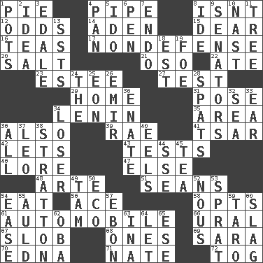 ACROSS 1. Sliced dessert 4. Corncob 8. Is not 12. Likelihood 14. An important port of Yemen 15. Letter starter 16. Afternoon social gatherings 17. Unrelated to defense, as in spending 20. Table seasoning 21. Bear (Spanish) 22. Had dinner 23. First name in cosmetics 27. Trial 29. Residence 31. Airs 34. Soviet premier 1918-24 35. Length times width 36. In addition 39. Actress Charlotte 41. Russian ruler of old 42. Allows 43. Trials 46. Old wives' tales, e.g. 47. Otherwise 48. Johnson of "Laugh-In" 51. Actors Connery and Penn 54. Ingest 56. Adept person 58. Elects 61. Car 66. Mountain range 67. Messy guy 68. Singles 69. "Two Mules for Sister ____" 70. Pulitzer Prize-winning author Ferber 71. Nathan's nickname 72. Coat; cloak DOWN 1. Cooking vessels 2. The main thing one is thinking about 3. Peak District village in England 4. Baking dish 5. Wedding promise 6. Fenced enclosure 7. Inside; within (prefix) 8. Binary compound 9. Elected representatives 10. Political cartoonist Thomas 11. Woody plant 13. Fast planes 18. Eastern Standard Time (abbr.) 19. Enemy 24. Definite Article 25. Period of immesurable duration 26. Arab leader 28. Arguments over trivial matters 30. Related on the mother's side 32. Ocean 33. Hearing organ 34. Failure 36. Everything 37. Lion 38. Ski resort town in Vermont 40. Snakelike fish 44. Compass dir. 45. Afternoon social gathering 49. Scottish cap 50. Environmental prefix 52. Good sense 53. Small fatty European fish 54. Comfort 55. Old (Scot.) 57. Inky black, to poets 59. Pacific island yam 60. Volcanic refuse 62. Chief or king in Benin or Nigeria 63. _ tizzy (2 wds.) 64. Allow 65. Compass dir.