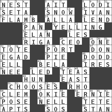 ACROSS 1. Egg locale 5. Small island 8. Farming town in central California 12. Bristle 13. Frozen precipitation 15. "Terrible" tsar 16. Flambe (short form) 18. Silent film actress Nazimova 19. Grant temporary use of 20. Baking dish 22. Crying or shouting loudly 24. Flair 26. French article 27. Port city in Latvia 28. Corporate head (abbr.) 29. Single 32. Carryall 35. Left side of a ship or aircraft 37. Spanish title 38. Mild oath 39. Sliced dessert 40. Texas town _ City 41. Pipe bend 42. Actor Lugosi 43. Angers 44. Born 45. Directed 46. Afternoon social gatherings 49. Attila the _ 50. 90 degrees 51. Elects 55. 17th letter of the Greek alphabet 56. Clement's nick name 57. Migrant worker of the '30s 59. Bert's buddy 63. Introduce or present, as a question 64. 1994 drama film starring Jodie Foster 65. False hair 66. Flats, for short 67. Distress signal 68. Comedian Laurel of Laurel & Hardy DOWN 1. Overdraft (abbr.) 2. Snakelike fish 3. R.R. building 4. ________ with (broke a safety seal) 5. White ___ sheet 6. In an inward manner 7. Lacquered or enameled metalware 8. Ms. Damita and namesakes 9. Baking chamber 10. Mild oath, euphamism for damn 11. Indiana (abbr.) 14. Place for singles 17. Indonesian resort city 21. Tired old horse 23. Lion 25. Slept 28. Cause to be 29. Scent 30. Connecting point 31. Conclusions 32. Adolescent 33. Stare 34. Story 36. Petroleum 40. What propaganda does 42. Gillaume's butler role 45. Nilotic language 47. Hearing organ 48. American tennis player Robert 49. Dwellings 51. Hoof sound 52. Behest 53. Supplements with great effort 54. Grain storage tower 56. Accounting whiz (abbr.) 58. Raised railways 60. Fish or hair follower 61. Call ___ day 62. Car or cant ending