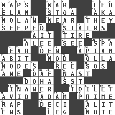 ACROSS 1. Atlas contents 5. Armed conflict 8. Directed 11. Style 12. Portico 14. Alias (abbr.) 15. Pitcher Ryan 17. Erode 18. Those people 19. Oozed 21. Flight of steps 23. Small island 25. Hoop that covers a wheel 26. Toward shelter 27. Observe 28. Health resort 31. Hearing organ 33. Lair 35. Bee-related 37. "This won't hurt ____!" 38. Lower and raise head in agreement 40. Spanish pot 41. Methods 43. To separate or throw off 45. Mayday 46. A saturated hydrocarbon 47. Clumsy lout 50. Political cartoonist Thomas 52. Capital of the state of Qatar 53. Fast jet (abbr.) 54. Sillier 56. Bathroom 61. Enthusiastic 62. First man 65. First class 66. Hit sharply and swiftly 67. Tenth: prefix 68. Came down and settled, as after flight 69. Followers of ems 70. Part of a journey 71. Make mention of DOWN 1. Not women's 2. Medicinal plant 3. Diluted with white 4. Fastener 5. Compass dir. 6. Had dinner 7. Exposes to great heat 8. Cowardly lion portrayer 9. Makes supply last 10. 24 hours 13. Nick name for Arthur 16. Anneal 18. Make a knot 20. Passed on 22. Type of rug 24. Adolescent 26. Johnson of "Laugh-In" 28. Grain storage tower 29. Friends 30. Santa ___, CA 31. Inky black, to poets 32. Helper 34. Not either 36. Mail 37. Housemaid (var.) 39. Habitations of wild animals 42. Within a short period 44. 90 degrees 48. Toward the future 49. Bundle 51. Constrict 52. Male parent 54. _ the terrible 55. Cuts off 57. SW Asia republic 58. _ and Stitch 59. Give off 60. Wig 61. "We ___ not amused" (Victoria) 63. Adept person 64. Russian fighter aircraft