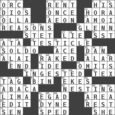 ACROSS 1. The grampus (Milton) 4. Monthly bill 8. Part of HMS, perhaps 11. "Vaya con ____" 13. Single time 14. Israeli folk dance 15. Water jar 16. A really long time 17. Mine, in Marseilles 18. Thinks logically 21. American astronaut and politician John 22. Proofreading order 23. Falsehood 25. Fast jet (abbr.) 26. _ moment's notice (2 wds.) 29. One of the two male reproductive glands 32. Twentieth part of a lira 34. Adept person 35. Daniel's nick name 38. Mountain range southwest of Kyrgyzstan 39. Moved through 41. Having or resembling wings 43. Conclusion 44. Binary compound 45. Leaves out 46. Eaten 50. John Ritter's dad 51. Label 54. Storage container 55. Makes supply last 57. Phillipine bananalike plant 59. Snuggling 63. Pale green bean 64. Mild oath 67. Type of rug 68. Prepare for publication 69. Unit of force 70. Take ten 71. Elected rep. 72. Moved rapidly 73. A female animal or person DOWN 1. Scent 2. Cause heat under the collar 3. Root beer relative 4. Exposes to great heat 5. Compass dir. 6. Non-commissioned officer (abbr.) 7. "___ Little Indians" 8. Dwellings 9. Removes the wrinkles 10. Virtuous person 12. Backtalk 14. Actor Linden 19. "Beetle Bailey" pooch 20. Born 21. Set 23. Louse (plural) 24. On the rocks 26. White ___ sheet 27. Lacquered or enameled metalware 28. Actor Alda or Thicke 30. Proceeds 31. Dutch treat 33. "You Light Up My Life" star Conn 36. Set down 37. Nathan's nickname 39. Swiss mountan, "Queen of the Mountains" 40. Arabian gulf 42. Acura sports coupe 45. Lyric poems 47. Basketball assoc. 48. Watched over 49. Supplement with great effort 51. Falsehoods 52. Stay 53. Street urchin 56. Play the lead 58. Domesticated feline 60. Angers 61. Soft 62. Yard entry 64. Begley and Asner 65. Con 66. A saturated hydrocarbon