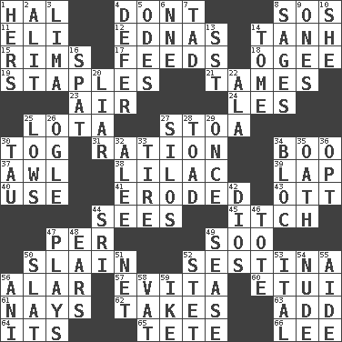 ACROSS 1. Actor Linden 4. Do not 8. Mayday 11. Biblical high priest 12. Ferber et al. 14. Hyperbolic tangent 15. Basketball hoops 17. Eats 18. Double curve, resembling the letter S 19. Paper fasteners 21. Domesticates 23. Atmosphere 24. French article 25. Globular water bottle used in Asia 27. Portico 30. Coat; cloak 31. Food allowance for one day 34. Surprise greeting 37. Leather borer 38. Pale purple color 39. Pet locale 40. Purpose 41. Eaten away 43. Baseball player Mel 44. Observes 45. Hankering 47. For each 49. "Barney Miller" actor Jack 50. Killed 52. French poetic form 56. Having or resembling wings 57. Webber/Rice musical 60. Needle holder 61. Negative votes 62. Proceeds 63. Say or write further 64. ___ a Wonderful Life 65. False hair 66. Area sheltered from the wind DOWN 1. Possessive pronoun 2. Set down 3. Pale green bean 4. Postpone 5. Lyric poems 6. Compass dir. 7. Small boy 8. Gurus 9. Washington bills 10. A female animal or person 13. Fast jet (abbr.) 14. Heavy book 16. Argument over a trivial matter 20. One who doesn't tell the truth 22. Chicken ___ king 25. Moos 26. Stare 27. Grain storage towers 28. Frog relative 29. Single time 30. The 19th letter of the Greek alphabet 32. Toward shelter 33. Hoop that covers a wheel 34. Coalition 35. Pledge 36. Choose 42. "Vaya con ____" 44. _ Lanka 46. Carry 47. Live dramatic performances 48. Hearing organs 49. Gospel singer Marvin 50. Narrow board 51. Fish or hair follower 52. Proofreading order 53. Slanted text style (abbr.) 54. Naked 55. Helper 56. Black tropical American cuckoo 58. Large container 59. Eisenhower's nickname