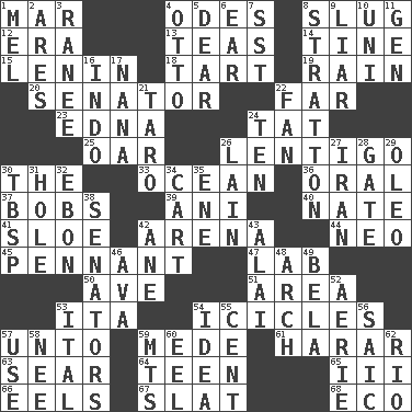 ACROSS 1. Third mo. 4. Lyric poems 8. Strike heavily 12. Period 13. Afternoon social gatherings 14. Prong on a fork 15. Soviet premier 1918-24 18. Small pie 19. Precipitation 20. Elected representative 22. At a great distance 23. Pulitzer Prize-winning author Ferber 24. Make lace 25. Rowing implement 26. Small, flat, pigmented spot on the skin 30. Definite Article 33. Sea 36. Of the mouth 37. Moves up and down 39. Cuckoo 40. Nathan's nickname 41. A type of plum 42. Sports stadium 44. Modern: prefix 45. Pre-World Series prize 47. Experiment locale 50. "___ Maria" 51. Length times width 53. Call ___ day 54. Winter's stalactites 57. To (old English) 59. Ancient Persian 61. Ethiopian city, capital of Harari 63. Dry up 64. Adolescent 65. One more than two 66. Snakelike fish 67. Narrow board 68. Environmental prefix DOWN 1. Cartoonist voice _ Blanc 2. Ancient Greek god of war 3. Indian princess (variant) 4. "Beetle Bailey" pooch 5. Letter starter 6. Hearing organ 7. Fast jet (abbr.) 8. Ski resort town in Vermont 9. One who doesn't tell the truth 10. University (slang) 11. Commissioned military rank (abbr.) 16. Southeast Asian peninsula 17. Nanny 21. Pacific island yam 22. Air blower 24. "___ Little Indians" 26. (Had) reclined 27. SW Asia republic 28. Yard entry 29. Margarine 30. Cook's measure (abbr.) 31. Hollow 32. Inky black, to poets 34. Heavy open wagon 35. Compass dir. 38. Legislators 42. A saturated hydrocarbon 43. Jai ____ 46. Actress Gardner 48. Bowlike part 49. Actor Lugosi 52. Nest on high 53. Slanted text style (abbr.) 54. The content of cognition 55. Penny 56. Ketch in the Levant 57. Purpose 58. Born 59. Mountains (abbr.) 60. Snakelike fish 62. River (Sp.)