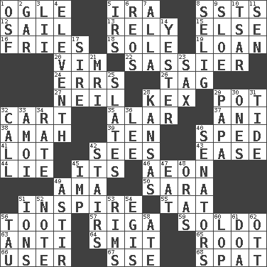 ACROSS 1. Stare 5. Retirement account (abbr.) 8. Fast planes 12. Move on water 13. Have trust in 15. Otherwise 16. Strips of potato fried in deep fat 18. Not divided or shared with others 19. Grant temporary use of 20. Zeal 22. More disrespectful 24. Blunders 26. Label 27. Famous astronaut Armstrong 28. A weed 29. Cooking vessel 32. Heavy open wagon 35. Having or resembling wings 37. Black tropical American cuckoo 38. Nanny 39. Nine, plus one 40. Broke a traffic law 41. Car dealer's back yard 42. Observes 43. Relaxation 44. Whopper 45. It is 46. Period of immesurable duration 49. Wet nurse (var.) 50. "Two Mules for Sister ____" 51. Stimulate to action 55. Make lace 56. A blast of a horn 57. Port city in Latvia 59. Twentieth part of a lira 63. Against 64. Stricken, poetically 65. Carrot, for example 66. One who makes use of a thing 67. Compass dir. 68. Petty quarrel DOWN 1. Order of Saint Francis (abbr.) 2. Slender fish 3. Cards in a Roman deck? 4. Veterans Day date 5. Big collection agency 6. Vintage cars 7. Silent film actress Nazimova 8. Former Milwaukee Brewers owner Bud 9. A type of plum 10. Russian ruler of old 11. Elected rep. 14. Last 17. Male parent of an animal 21. Medical imaging device (abbr.) 23. Saxophone 25. Chalkboards 28. Sunflower state 29. Dad 30. Singles 31. Periodic rise and fall of the sea level 32. Give a ring to 33. Mine, in Marseilles 34. Pace 36. Area sheltered from the wind 40. Elected representatives 42. Flight of steps 45. Naughty child 47. Consume 48. Mouths or openings 49. Moving about 51. Charged particles 52. Brief written record 53. Basketball hoops 54. The front part of a cuirass 56. The 19th letter of the Greek alphabet 58. Had dinner 60. Chop off 61. ___ good deed 62. Baseball player Mel