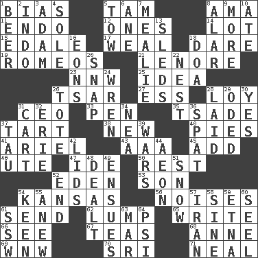 ACROSS 1. Prejudice 5. Scottish cap 8. Nanny (var.) 11. Inside; within (prefix) 12. Washington bills 14. Car dealer's back yard 15. Peak District village in England 17. Welt 18. Have the gumption 19. Lover boys 21. Poe poem 23. Compass dir. 25. The content of cognition 26. Russian ruler of old 27. Double-curved letter 28. Myrna of the movies 31. Corporate head (abbr.) 33. Fenced enclosure 35. Sadhe (variant) 37. Small pie 38. ___ Haven, CT 40. Sliced desserts 41. Satellite of Uranus 43. American Automobile Association (abbr.) 45. Say or write further 46. Shoshoni 47. Binary compound 50. Respite 52. Paradise 53. Manchild 54. Sunflower state 56. Annoying sounds 61. Transmit 62. Mass 65. Compose 66. Perceive with the eye 67. Afternoon social gatherings 68. Singer Murray 69. Compass dir. 70. _ Lanka 71. Be tempered by heat DOWN 1. Fermented drink made from hops 2. Southeast Asian peninsula 3. First of billions? 4. Flatfish 5. Pull behind 6. One (Scot) 7. Ear of corn 8. Having or resembling wings 9. Greater amount 10. Had dinner 13. Bobsleighs 16. Immeasurably long periods of time 18. ___ good deed 20. Fastener 22. Egg locale 24. Songbird 26. Carry 28. Put down 29. Wrote a lyric poem 30. Consenting reply 31. Heavy open wagon 32. One of the Great Lakes 34. Teachers' org. 36. Petty quarrel 37. The 19th letter of the Greek alphabet 39. Armed conflicts 42. Flaplike coverings 44. Period of immesurable duration 48. Started a card game 49. Takes place subsequently 51. Frozen precipitation 52. Conclude 54. Peachy ____! 55. Afresh 57. SW Asia republic 58. Trig term 59. Inactive volcano in Sicily 60. Sew up the eyelids of hawks and falcons 61. Compass dir. 63. Third mo. 64. Air pressure measure (abbr.)