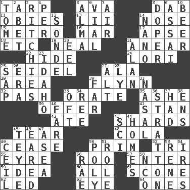 ACROSS 1. Canvas cover 5. Actress Gardner 8. Small moist lump or mass 11. Off-Broadway awards 13. Cards in a Roman deck? 14. Sense of smell 15. Paris' subway 16. Impair 17. Domed church section 18. And so on (abbr.) 19. Actress Patricia 21. Approach 22. Flintstone garb 24. Australian parrot (variant) 25. A glass for beer 27. Insect wing 29. Type of rug 30. Film actor Errol 32. Romantic infatuation 33. Declaim 35. American tennis player Robert 39. Auction bid 41. Comedian Laurel of Laurel & Hardy 42. Had dinner 43. Broken pieces 45. Rend 48. Root beer relative 49. Stop 50. Demure 52. Three (prefix) 55. Jane of fiction 56. Friend of Pooh 57. Keyboard key 59. It may be bright or harebrained 60. 100% 61. Biscuitlike quick bread 62. Directed 63. Sight organ 64. Singles DOWN 1. Heavy book 2. Collude with 3. Actors Guy, Robert Welles, and Clint 4. For each 5. _ mater 6. Small bottle 7. Atmosphere 8. Drug addict 9. Slender Brazilian palm 10. Fermented drink made from hops 12. Something which is sent 14. Billionth: prefix 20. Snakelike fish 21. ____ Jay Lerner 23. Potato state 25. Plant excrement 26. Period 27. The first octave above the treble staff 28. Potassium hydroxide 30. At a great distance 31. Relating to the nose 33. Often (poetically) 34. To separate or throw off 36. Ski resort town in Vermont 37. Possessed 38. Followers of ems 40. Conductor's collection 43. _-fi 44. Residences 45. Miss Universe 1986, Barbara Palacios _ 46. Having ears or earlike features 47. Toward the sea 49. To provide with a ceiling 50. Many (prefix) 51. Hero or heavy, e.g. 53. French philosopher Descartes 54. Angers 56. Actress Charlotte 58. Non-commissioned officer (abbr.)