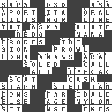 ACROSS 1. Plant excrements 5. Bear (Spanish) 8. White ___ sheet 11. To the left, to Queeg 13. Call ___ day 14. Relating to the mouth 15. Ms. Damita and namesakes 16. Not either 17. Actor's bit 18. Make lace 19. "____ silly question..." 21. Having winglike extensions 22. Make new 24. Grandmother 25. Eats (away) 27. Binary compound 29. The Jewish people; Israel 30. Move like a hungry wolf 32. Pulitzer Prize-winning author Ferber 33. Collect or gather 35. Blind as ____ 39. Having a sole or soles 41. Give a ring to 42. Keyboard modifier key 43. Medicinal drug used to evoke vomiting 45. Scram! 48. Keg 49. Staphylococcus 50. Proofreading order 52. Scottish cap 55. Immeasurably long periods of time 56. Distant 57. Peak District village in England 59. Otherwise 60. Grow older 61. High-strength synthetic material 62. Put into a specified state 63. Overdraft (abbr.) 64. Supplements with great effort DOWN 1. Table seasoning 2. Capital of Western Samoa 3. Characterized by complete cowardliness 4. Indian title of respect (Mr.) 5. Pig sound 6. Portico 7. Rowing implement 8. Believer in; advocate of (suffix) 9. Before Barbara or Clara 10. Toward shelter 12. Sadhe (variant) 14. Rounded earthenware pot or jar 20. Mayday 21. Afresh 23. Ferber et al. 25. Compass dir. 26. To free from 27. Big collection agency 28. Two (Sp.) 30. Groovy apt. 31. Shoestrings 33. Everything 34. Was introduced to 36. Sass 37. In the manner of 38. Affectionate concern, for short 40. Pledge 43. Frozen water 44. Eucharist need 45. Took without asking 46. 2nd pers. sing. pres. of can (arch.) 47. Domed church section 49. Perceives with the eye 50. Sinks 51. Not kosher 53. Medicinal plant 54. Not women's 56. Air blower 58. Color