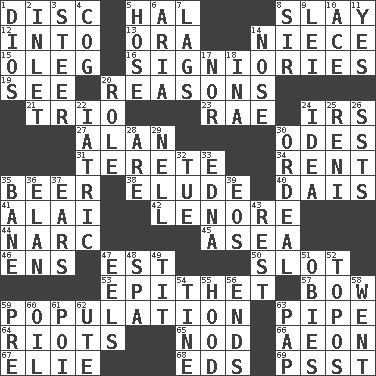 ACROSS 1. Flat circle 5. Actor Linden 8. Kill 12. To the inside or interior of 13. Mouth or opening 14. Sibling's daughter 15. Cassini of fashion 16. Seigniories (variant) 19. Perceive with the eye 20. Thinks logically 21. Musical group of three 23. Actress Charlotte 24. Big collection agency 27. ____ Jay Lerner 30. Lyric poems 31. Cigar-shaped 34. Monthly bill 35. Fermented drink made from hops 38. Evade 40. Raised platform 41. Mountain range southwest of Kyrgyzstan 42. Poe poem 44. Drug cop 45. Toward the sea 46. Followers of ems 47. Eastern Standard Time (abbr.) 50. Groove 53. Curse 57. Ribbon knot 59. Census information 63. Corncob 64. Disturbances 65. Dreamland 66. Period of immesurable duration 67. Writer Wiesel 68. Begley and Asner 69. Inconspicuous attention getter DOWN 1. "Vaya con ____" 2. An arm off of a larger body of water 3. Bull 4. Gear tooth 5. Flexible conduit 6. Operatic vocal solo 7. Fails to keep up a pace 8. Title for a knight 9. Luau accessory 10. Adept person 11. Affirmative reply 14. Characteristic smell of wine 17. Not either 18. _ tizzy (2 wds.) 20. Hero or heavy, e.g. 22. Of or pertaining to medicine 24. It may be bright or harebrained 25. Painter Guido (1575-1642) 26. Fast planes 28. "We ___ not amused" (Victoria) 29. 1994 drama film starring Jodie Foster 30. Severe or trying experience 32. Third day of the wk. 33. Pulitzer Prize-winning author Ferber 35. Object of repulsion 36. Enthusiasm 37. Hearing organs 39. Greek goddess of the dawn 43. Repose 47. Snakelike fish 48. Health resort 49. Teat (slang) 51. Off-Broadway awards 52. Traditional theme or motif 54. Prong on a fork 55. Parka part 56. Conclusions 58. Left 59. Before (prefix) 60. Lubricate 61. Luau course 62. Shoshoni 63. Infant food