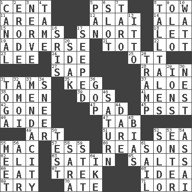 ACROSS 1. Penny 5. Pacific Standard Time (abbr.) 8. Pull behind 11. Length times width 12. Mountain range southwest of Kyrgyzstan 14. In the manner of 15. Typical models 17. Derisive sound 18. Allow 19. Contrary to your interests or welfare 21. Small child 22. Car dealer's back yard 23. Area sheltered from the wind 24. Binary compound 25. Baseball player Mel 27. Plant excrement 28. Precipitation 31. Scottish caps 35. Cask 37. Medicinal plant 38. Sign of things to come 39. Two (Sp.) 41. Not women's 42. Went 43. Writing tablet 45. Inconspicuous attention getter 46. Assistant 47. Bar bill 49. Nonscientific branch of learning 51. RI univ. 52. Ocean 55. Big _ 57. Curvy letter 60. Thinks logically 62. Biblical high priest 63. Smooth fabric 65. Table seasonings 66. Erode 67. Long journey 68. It may be bright or harebrained 69. Attempt to accomplish something 70. Had dinner 71. Australian parrot (variant) DOWN 1. Lessep's creation 2. Wear away 3. Impudent aggressiveness 4. Docile 5. Baking dish 6. Position in a hierarchy or organization 7. Edible starchy tuberous root 8. Baron Munchausen's specialties 9. Margarine 10. Electrical Unit 13. "Tell ____ the Marines!" 16. Indian titles of respect 17. Oozed 20. Neighbor of Neb. 26. _____ steamer (cargo ship) 29. Charged atoms 30. Egg locale 31. Ancient Roman robe 32. Mine, in Marseilles 33. Ananias' fault 34. Scornful expression 36. Republican Party 40. Titan orbits this 44. Have the gumption 48. Prejudice 50. Trial 52. Twentieth part of a lira 53. Keyboard key 54. Slender Brazilian palm 55. Confront 56. Having or resembling wings 58. "Two Mules for Sister ____" 59. Proofreading order 61. Move on water 64. Eisenhower's nickname